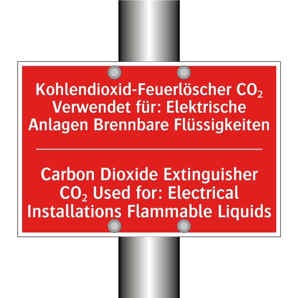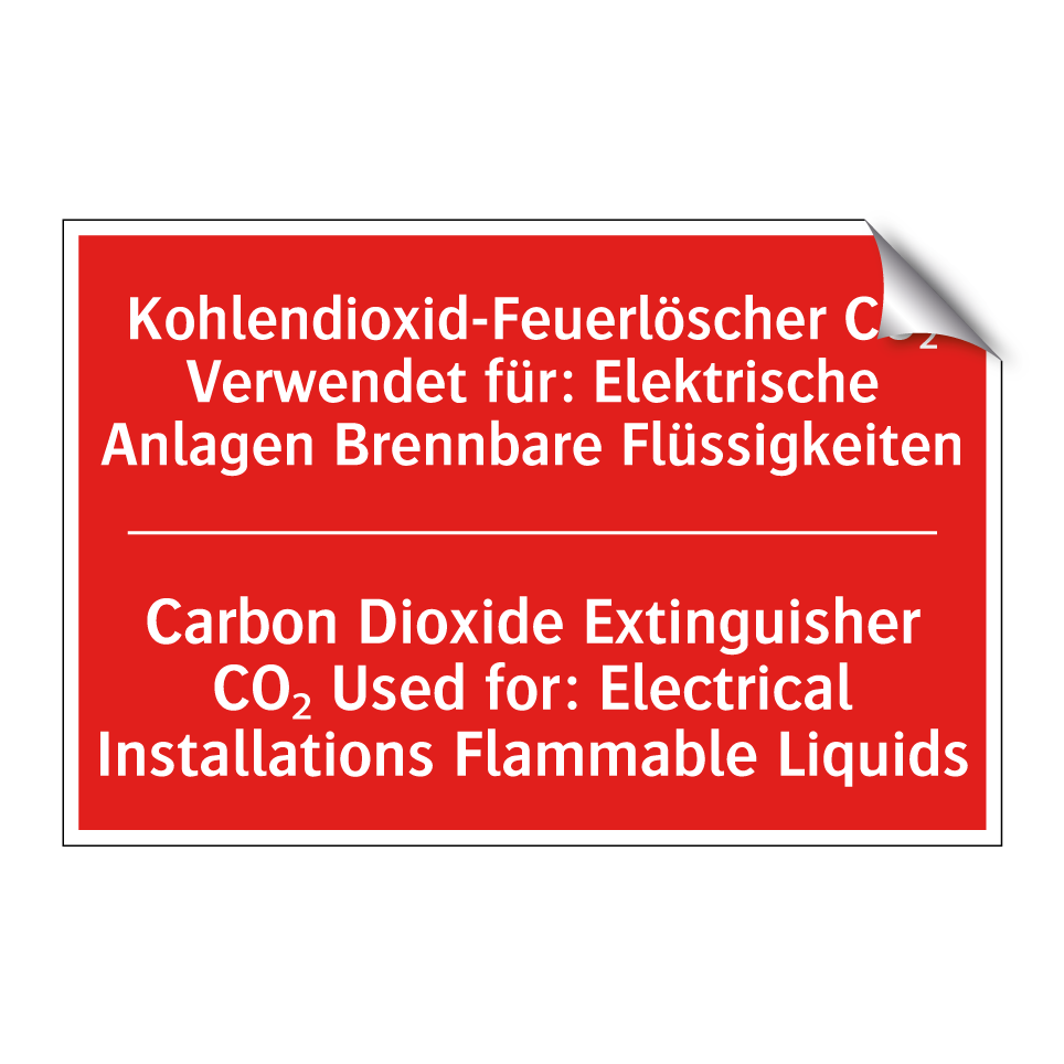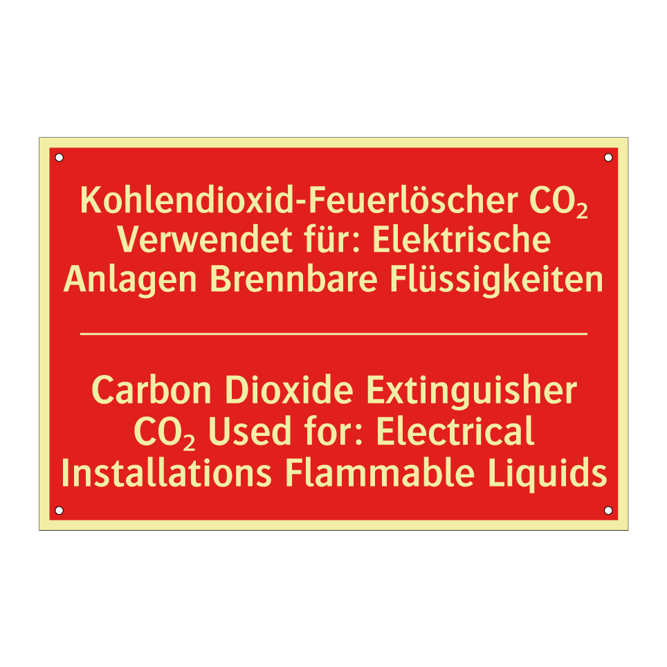 Zweisprachiges Brandschutzschild mit deutschem Text Kohlendioxid-Feuerlöscher CO₂ Verwendet für: Elektrische Anlagen Brennbare Flüssigkeiten und englischem Text Carbon Dioxide Extinguisher CO₂ Used for: Electrical Installations Flammable Liquids