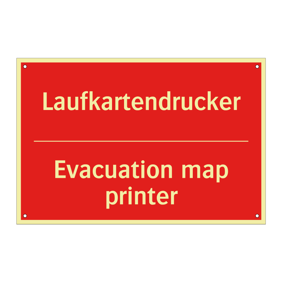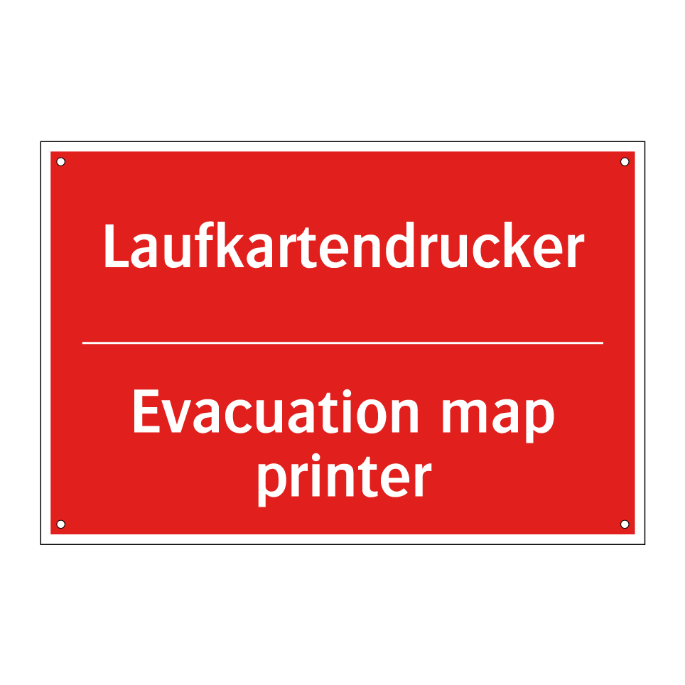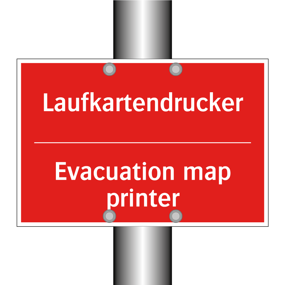 Zweisprachiges Brandschutzschild mit deutschem Text Laufkartendrucker und englischem Text Evacuation map printer
