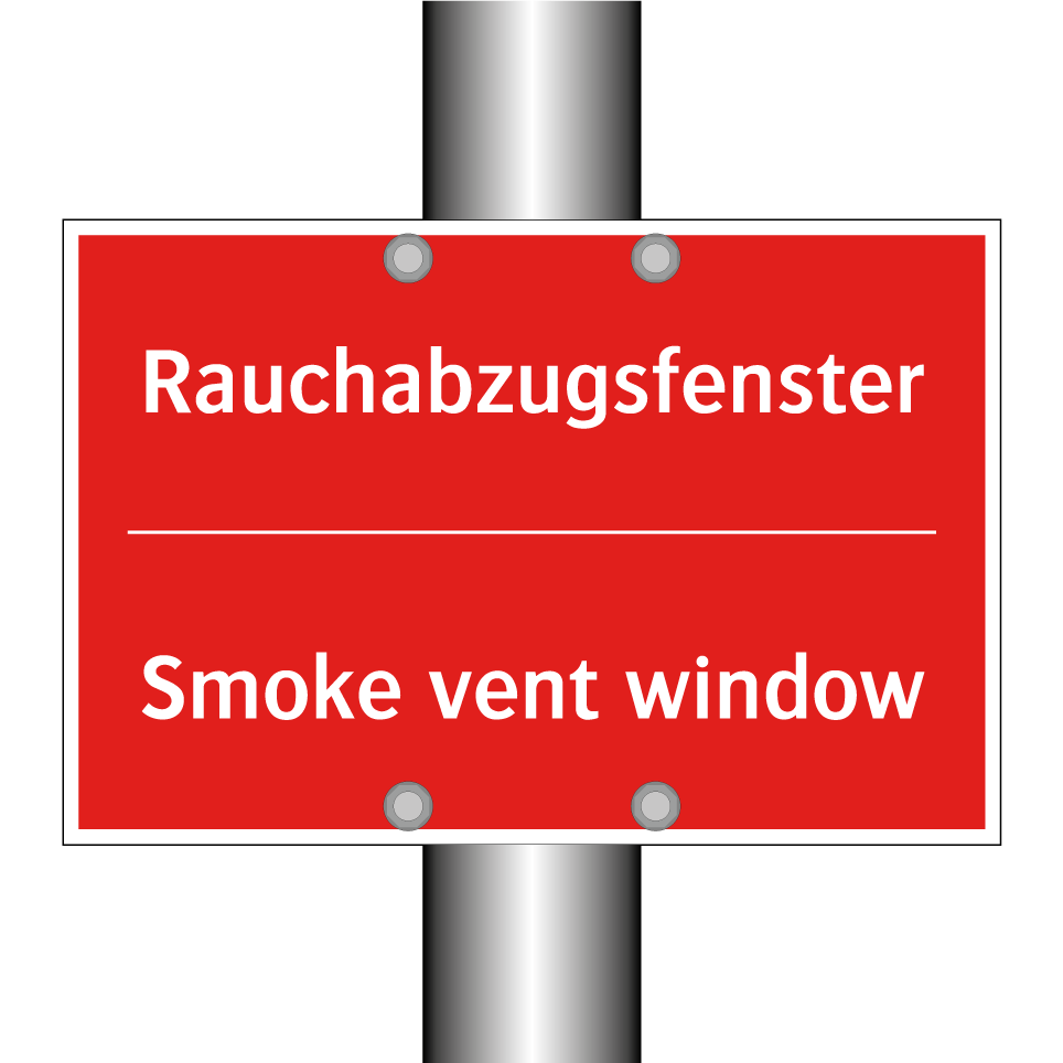 Zweisprachiges Brandschutzschild mit deutschem Text Rauchabzugsfenster und englischem Text Smoke vent window