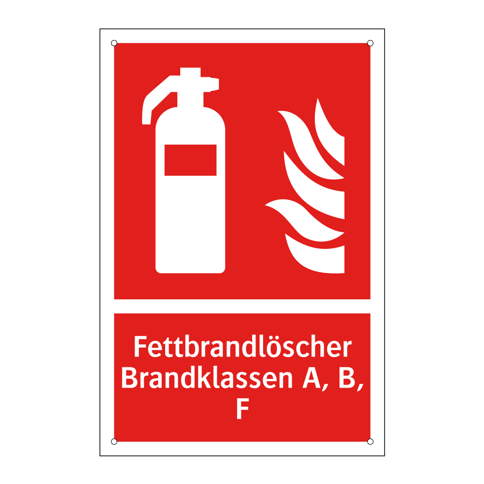 Brandschutzschild mit dem Text Fettbrandlöscher Brandklassen A, B, F