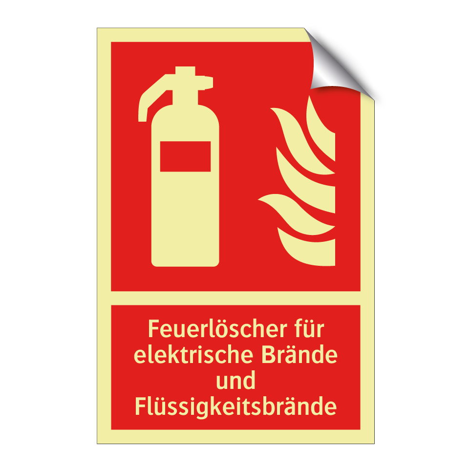 Brandschutzschild mit dem Text Feuerlöscher für elektrische Brände und Flüssigkeitsbrände