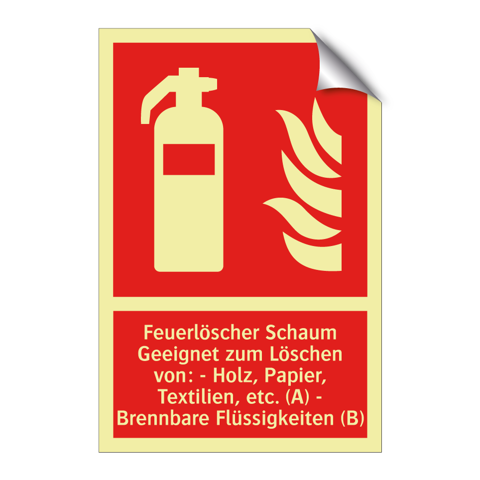 Brandschutzschild mit dem Text Feuerlöscher Schaum Geeignet zum Löschen von: - Holz, Papier, Textilien, etc. (A) - Brennbare Flüssigkeiten (B)