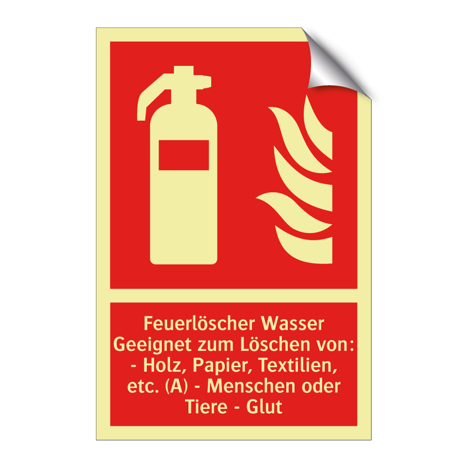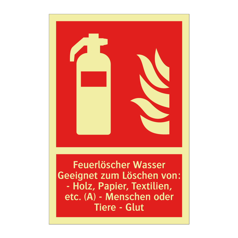Brandschutzschild mit dem Text Feuerlöscher Wasser Geeignet zum Löschen von: - Holz, Papier, Textilien, etc. (A) - Menschen oder Tiere - Glut
