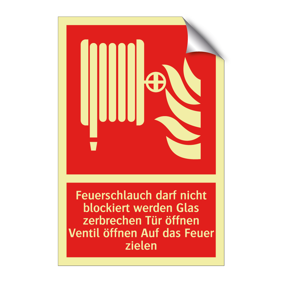Brandschutzschild mit dem Text Feuerschlauch darf nicht blockiert werden Glas zerbrechen Tür öffnen Ventil öffnen Auf das Feuer zielen
