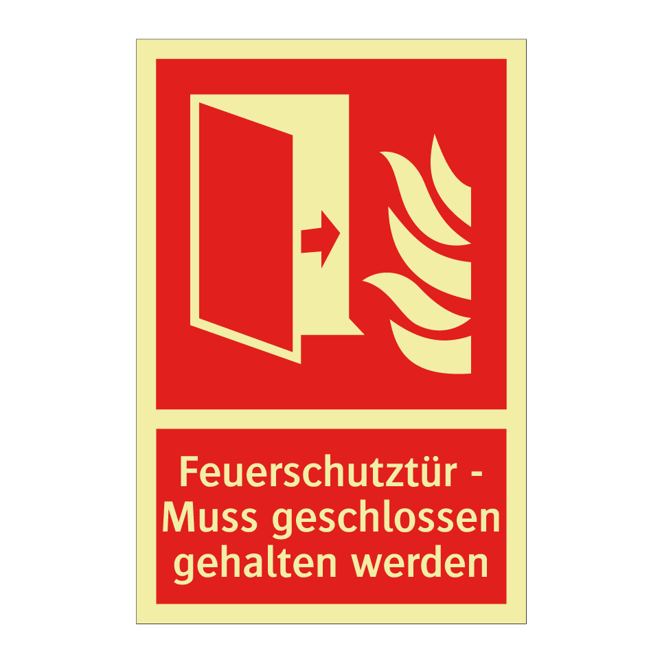 Brandschutzschild mit dem Text Feuerschutztür - Muss geschlossen gehalten werden