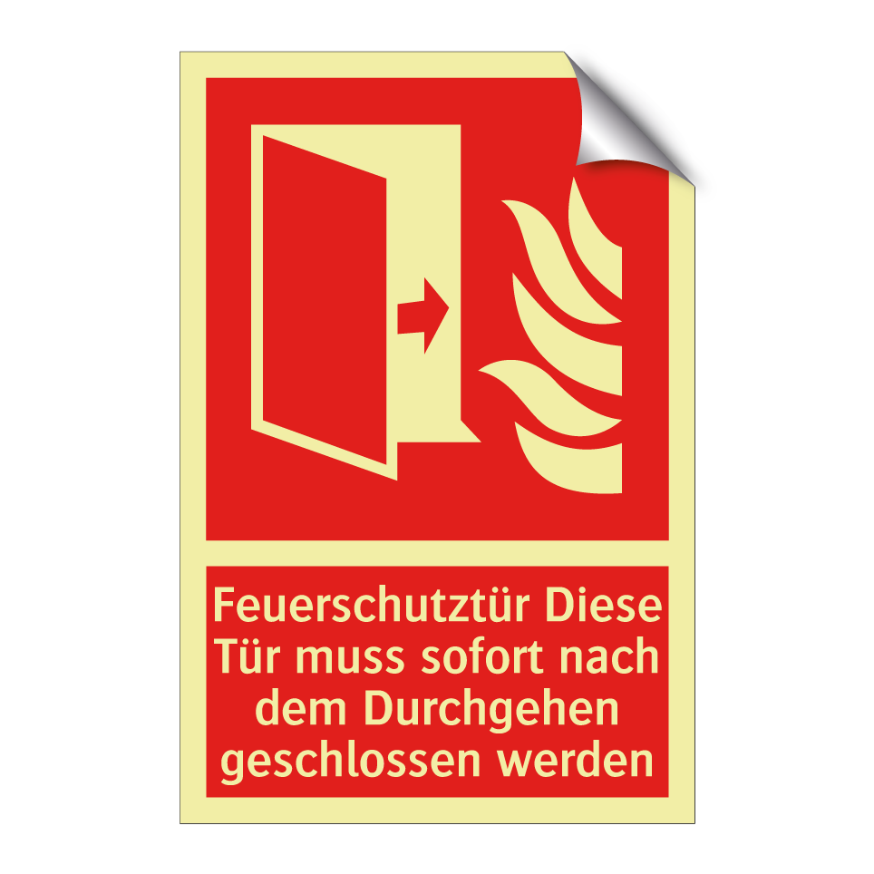Brandschutzschild mit dem Text Feuerschutztür Diese Tür muss sofort nach dem Durchgehen geschlossen werden