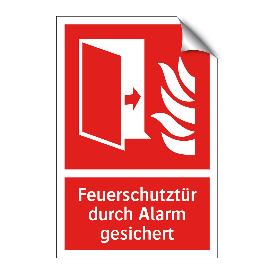 Brandschutzschild mit dem Text Feuerschutztür durch Alarm gesichert