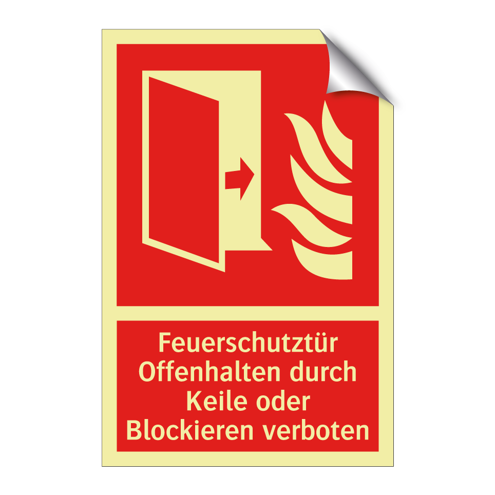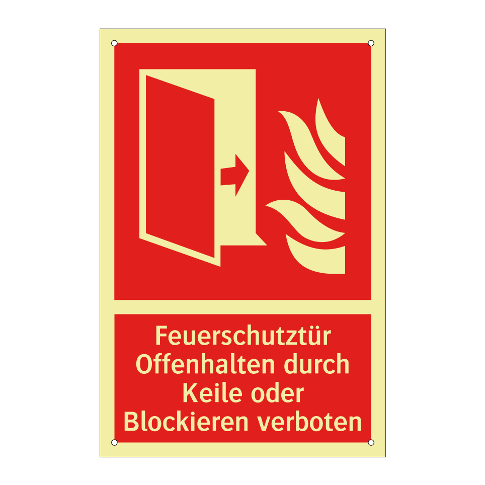Brandschutzschild mit dem Text Feuerschutztür Offenhalten durch Keile oder Blockieren verboten