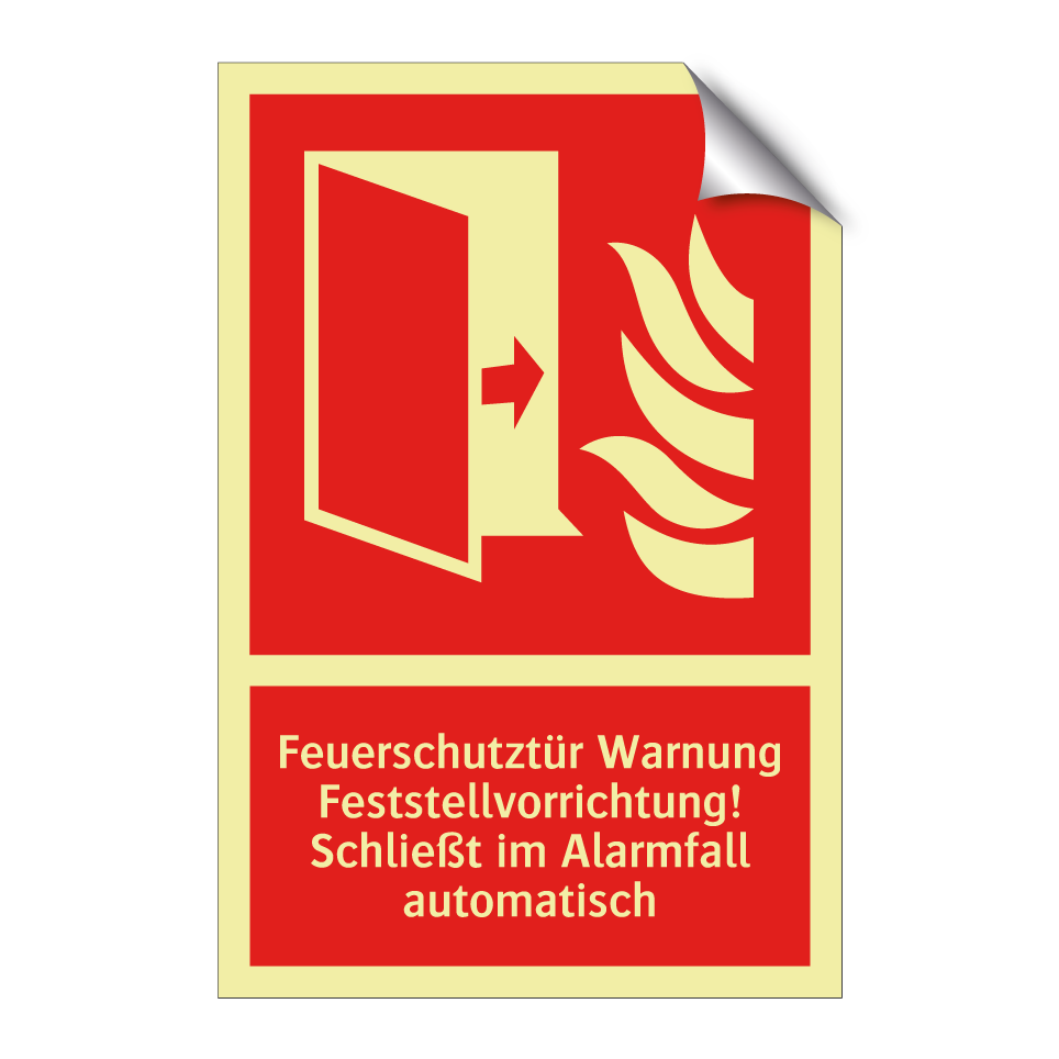 Brandschutzschild mit dem Text Feuerschutztür Warnung Feststellvorrichtung! Schließt im Alarmfall automatisch