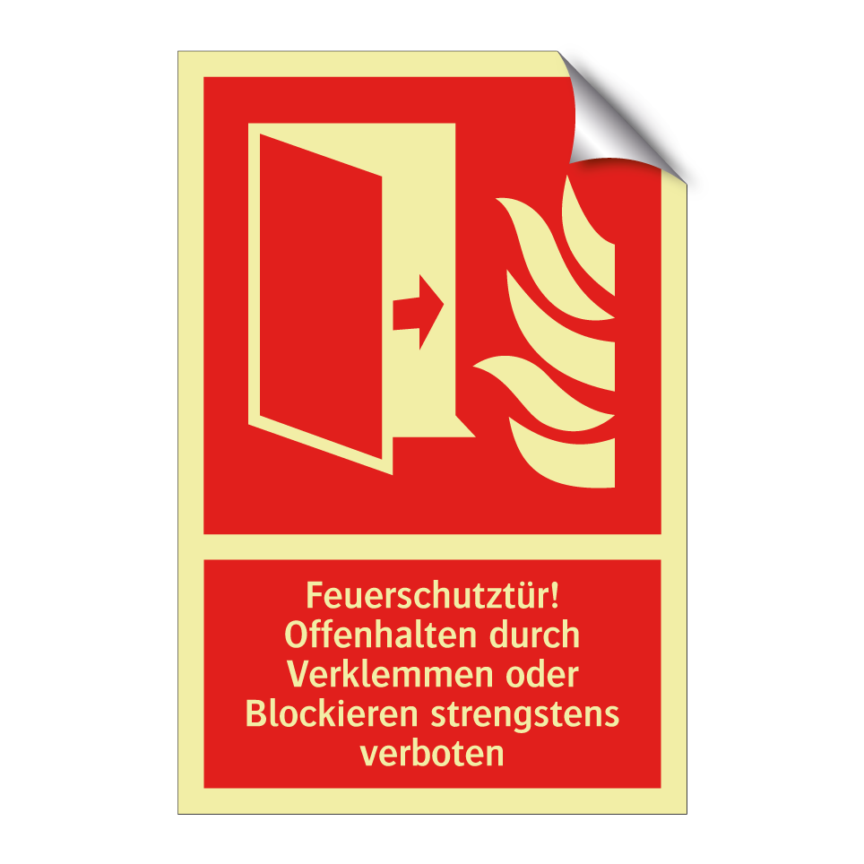 Brandschutzschild mit dem Text Feuerschutztür! Offenhalten durch Verklemmen oder Blockieren strengstens verboten