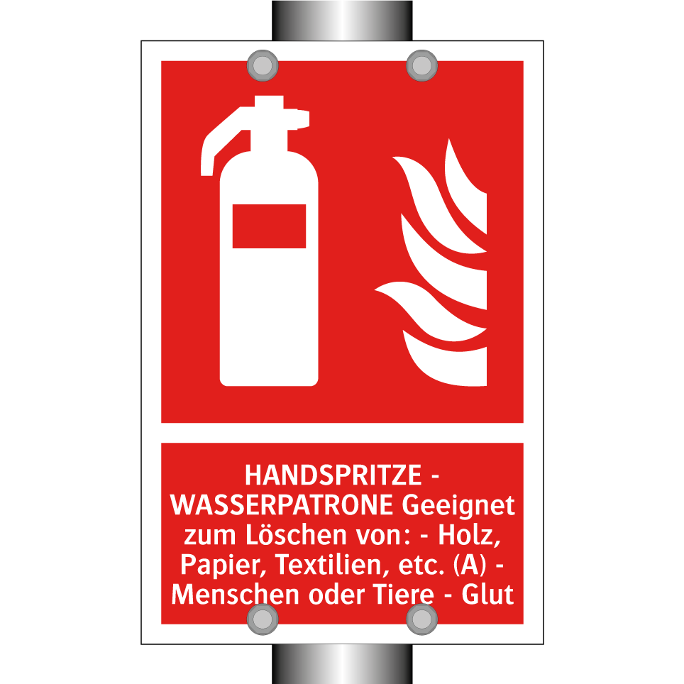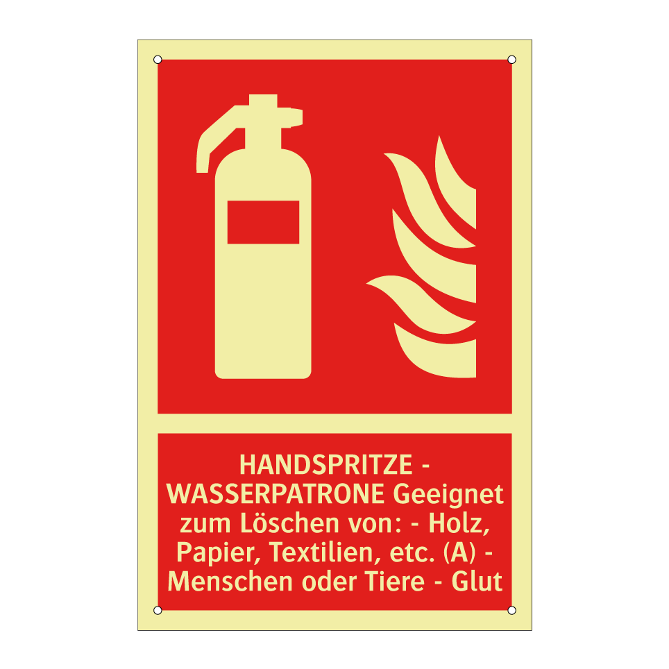 Brandschutzschild mit dem Text HANDSPRITZE - WASSERPATRONE Geeignet zum Löschen von: - Holz, Papier, Textilien, etc. (A) - Menschen oder Tiere - Glut