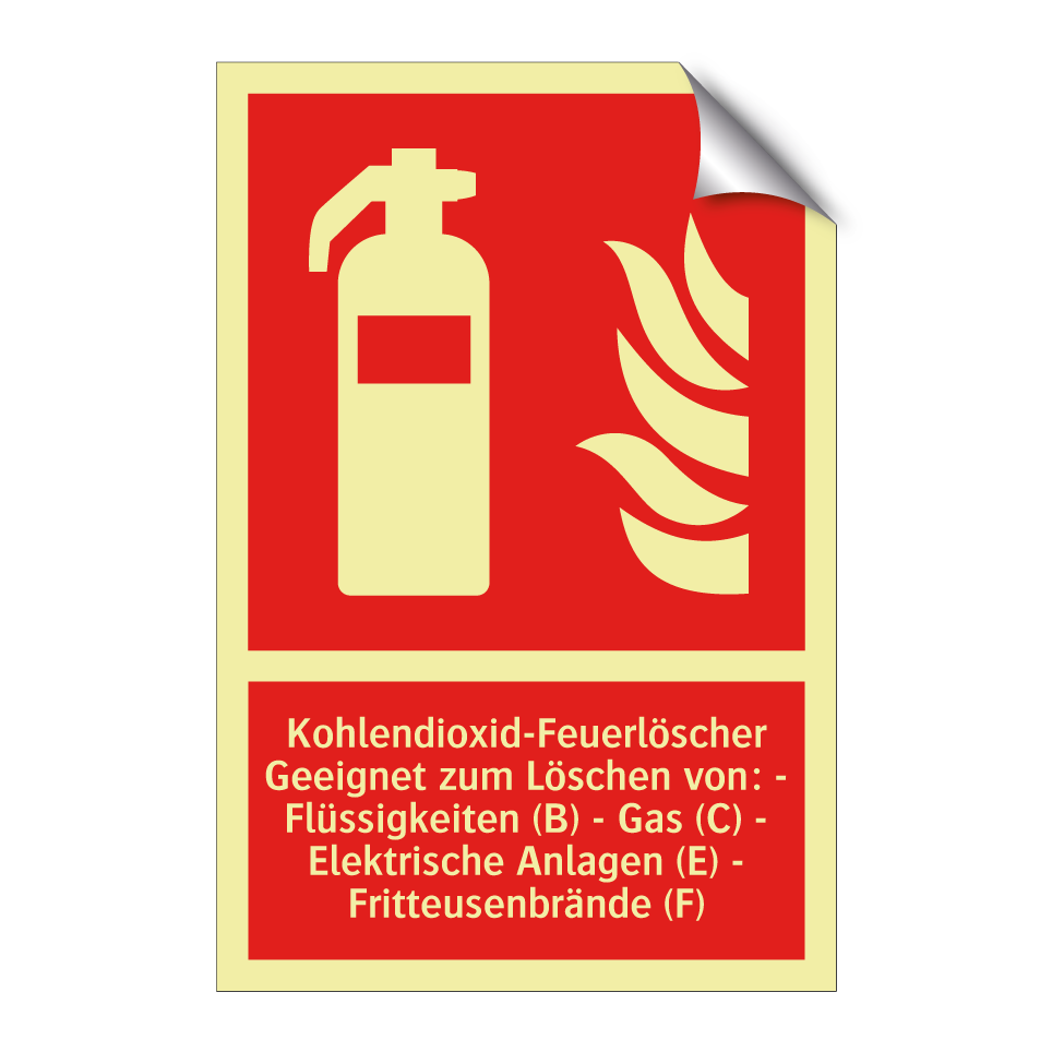Brandschutzschild mit dem Text Kohlendioxid-Feuerlöscher Geeignet zum Löschen von: - Flüssigkeiten (B) - Gas (C) - Elektrische Anlagen (E) - Fritteusenbrände (F)