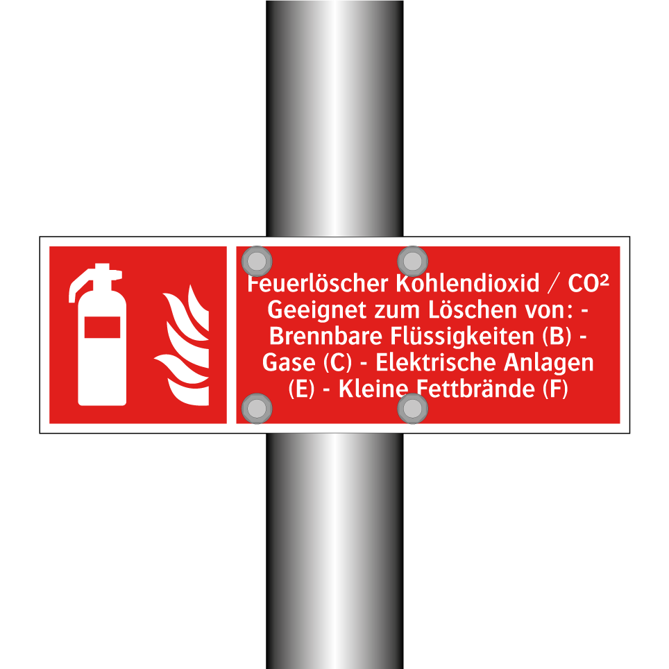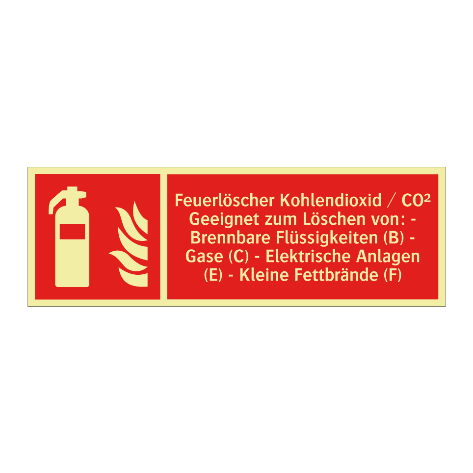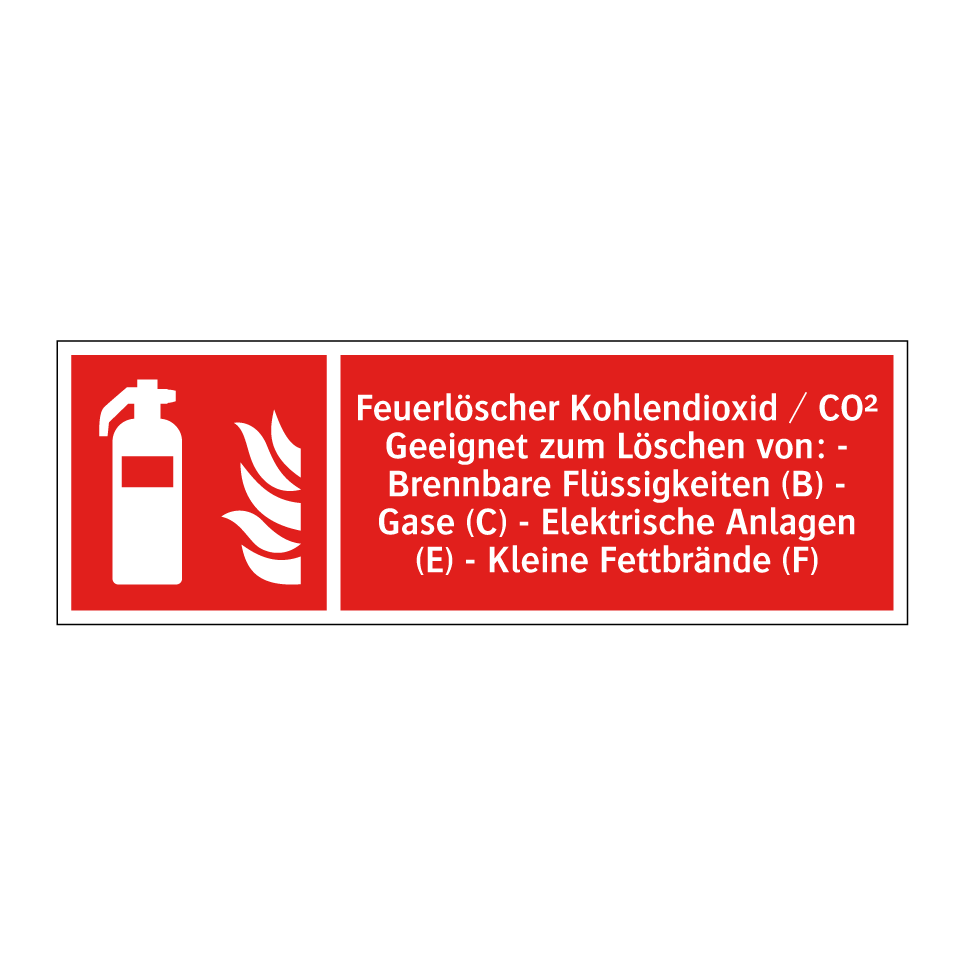 Brandschutzschild mit dem Text Feuerlöscher Kohlendioxid / CO² Geeignet zum Löschen von: - Brennbare Flüssigkeiten (B) - Gase (C) - Elektrische Anlagen (E) - Kleine Fettbrände (F)