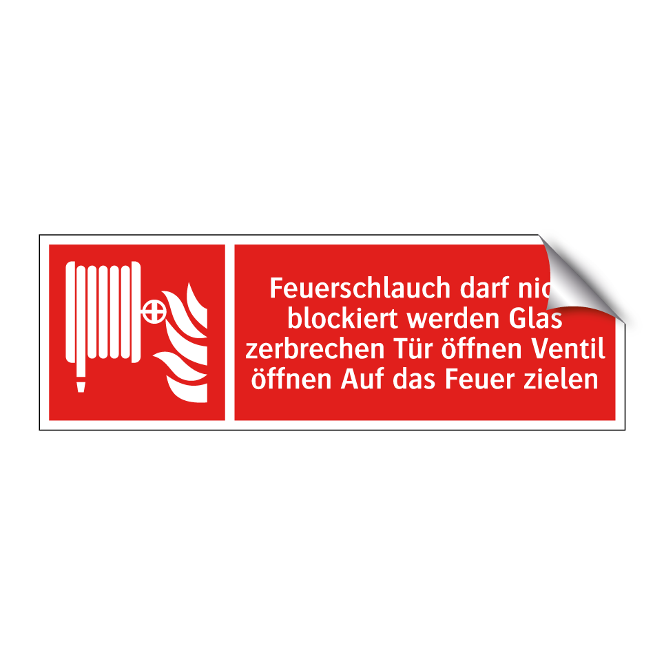 Brandschutzschild mit dem Text Feuerschlauch darf nicht blockiert werden Glas zerbrechen Tür öffnen Ventil öffnen Auf das Feuer zielen
