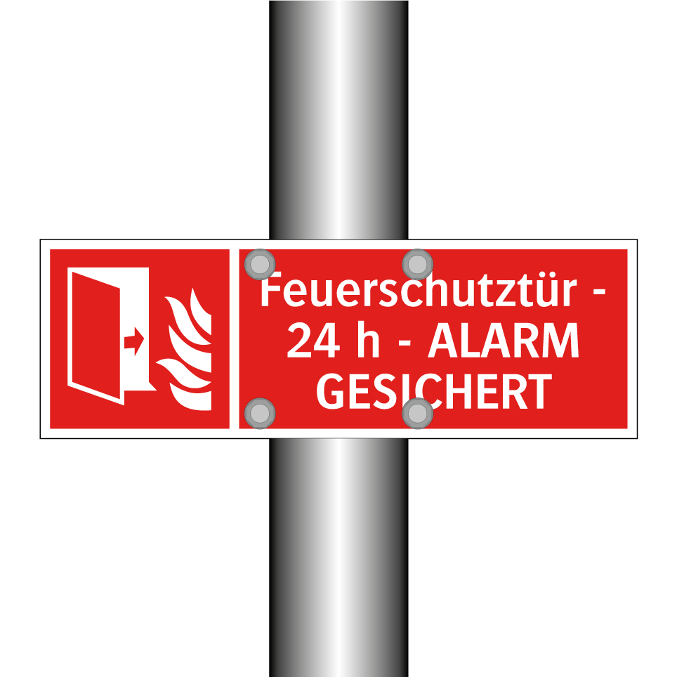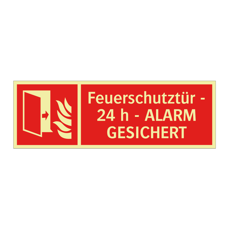 Brandschutzschild mit dem Text Feuerschutztür - 24 h - ALARM GESICHERT