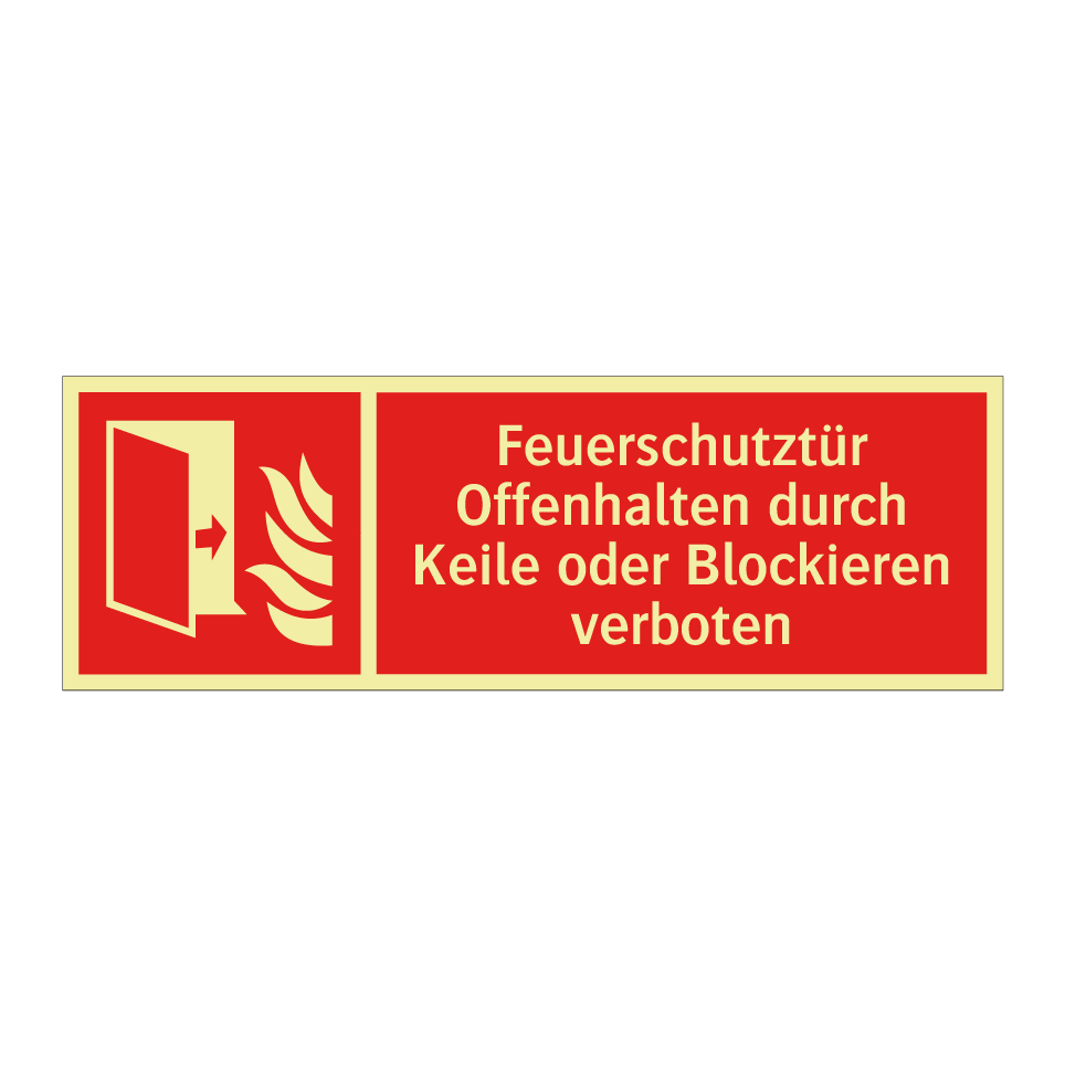 Brandschutzschild mit dem Text Feuerschutztür Offenhalten durch Keile oder Blockieren verboten
