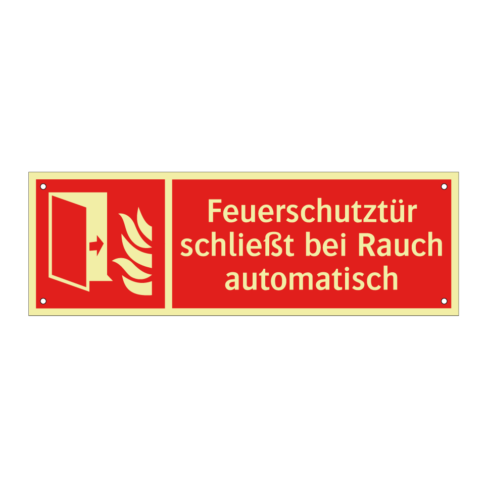 Brandschutzschild mit dem Text Feuerschutztür schließt bei Rauch automatisch