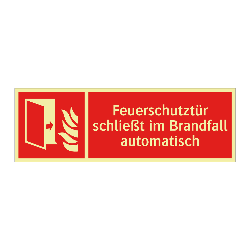 Brandschutzschild mit dem Text Feuerschutztür schließt im Brandfall automatisch