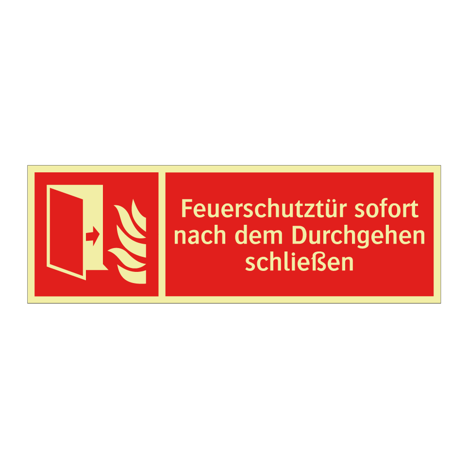 Brandschutzschild mit dem Text Feuerschutztür sofort nach dem Durchgehen schließen