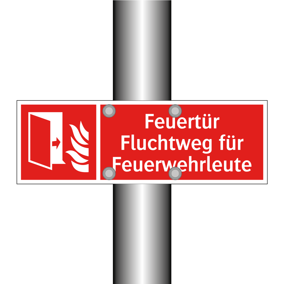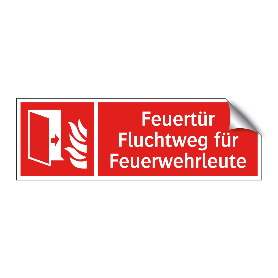 Brandschutzschild mit dem Text Feuertür Fluchtweg für Feuerwehrleute