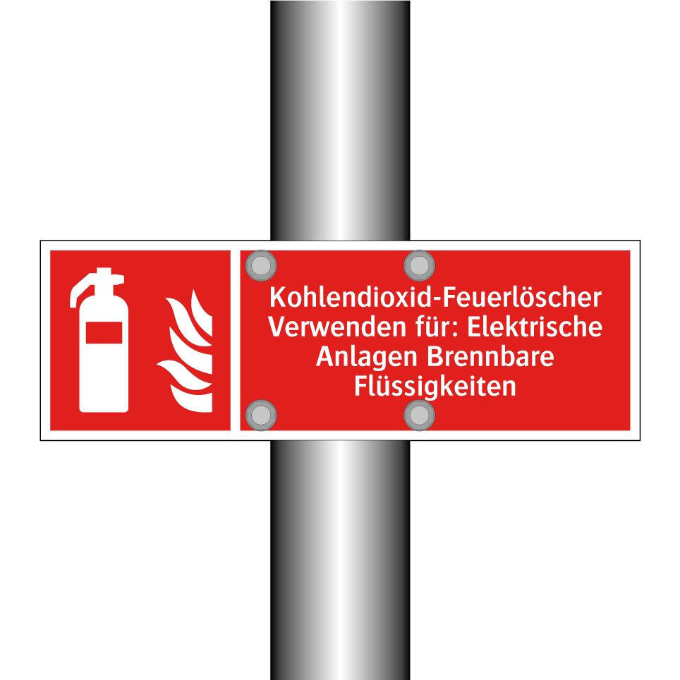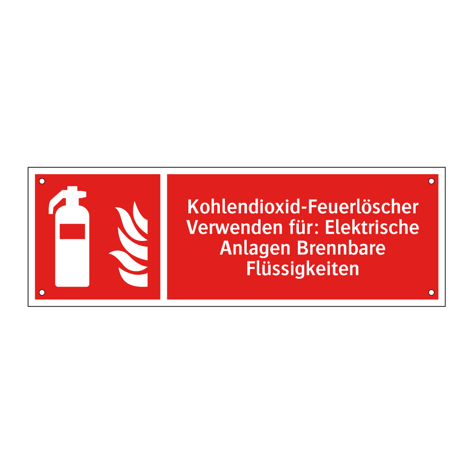 Brandschutzschild mit dem Text Kohlendioxid-Feuerlöscher Verwenden für: Elektrische Anlagen Brennbare Flüssigkeiten