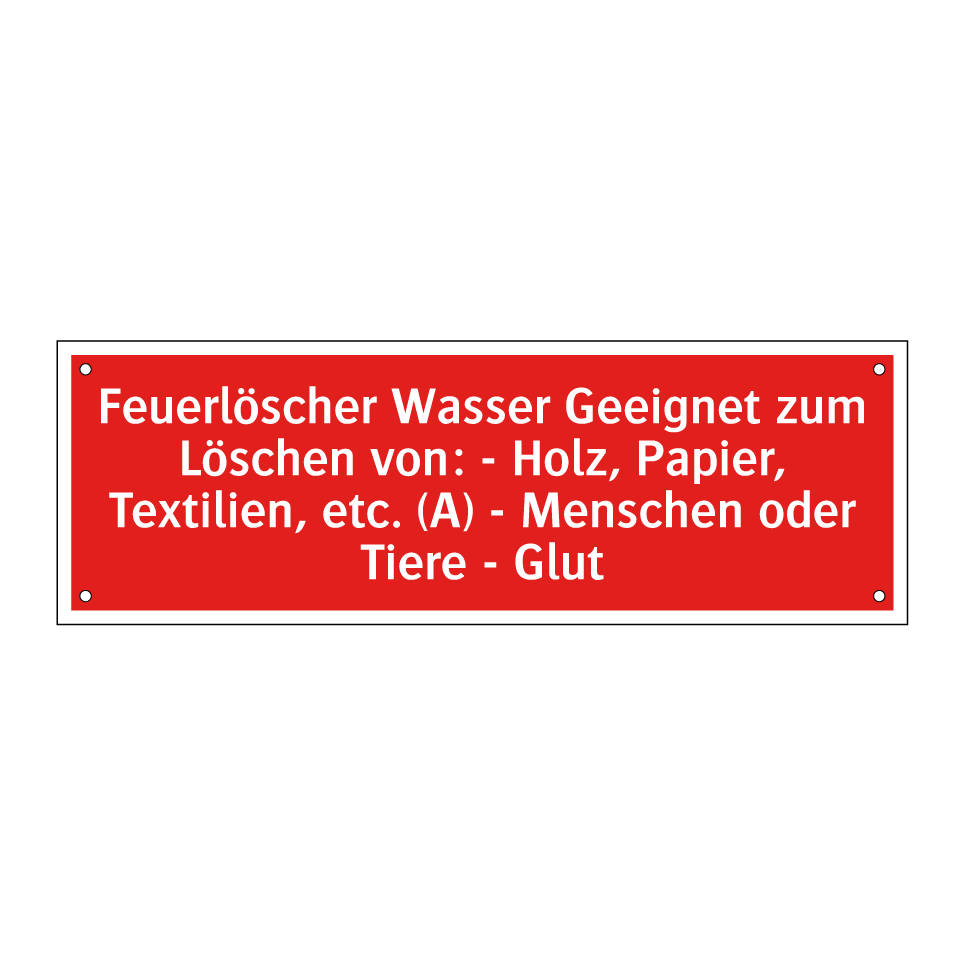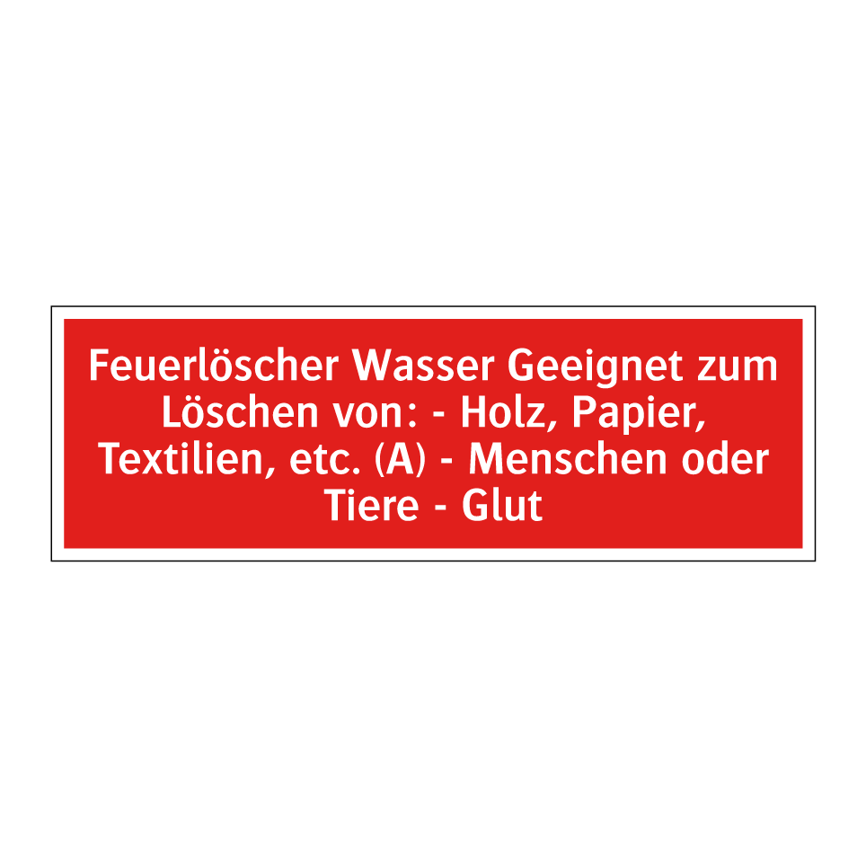 Brandschutzschild mit dem Text Feuerlöscher Wasser Geeignet zum Löschen von: - Holz, Papier, Textilien, etc. (A) - Menschen oder Tiere - Glut