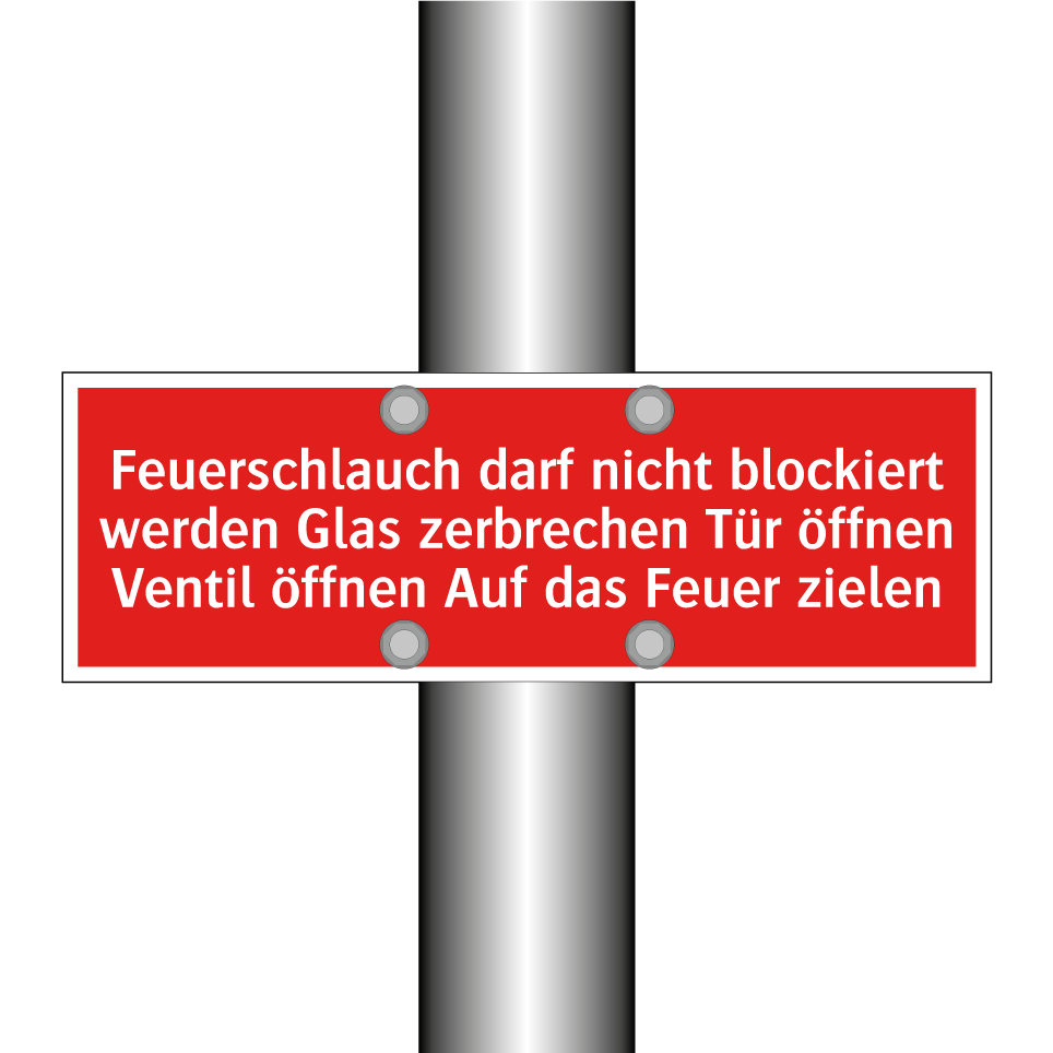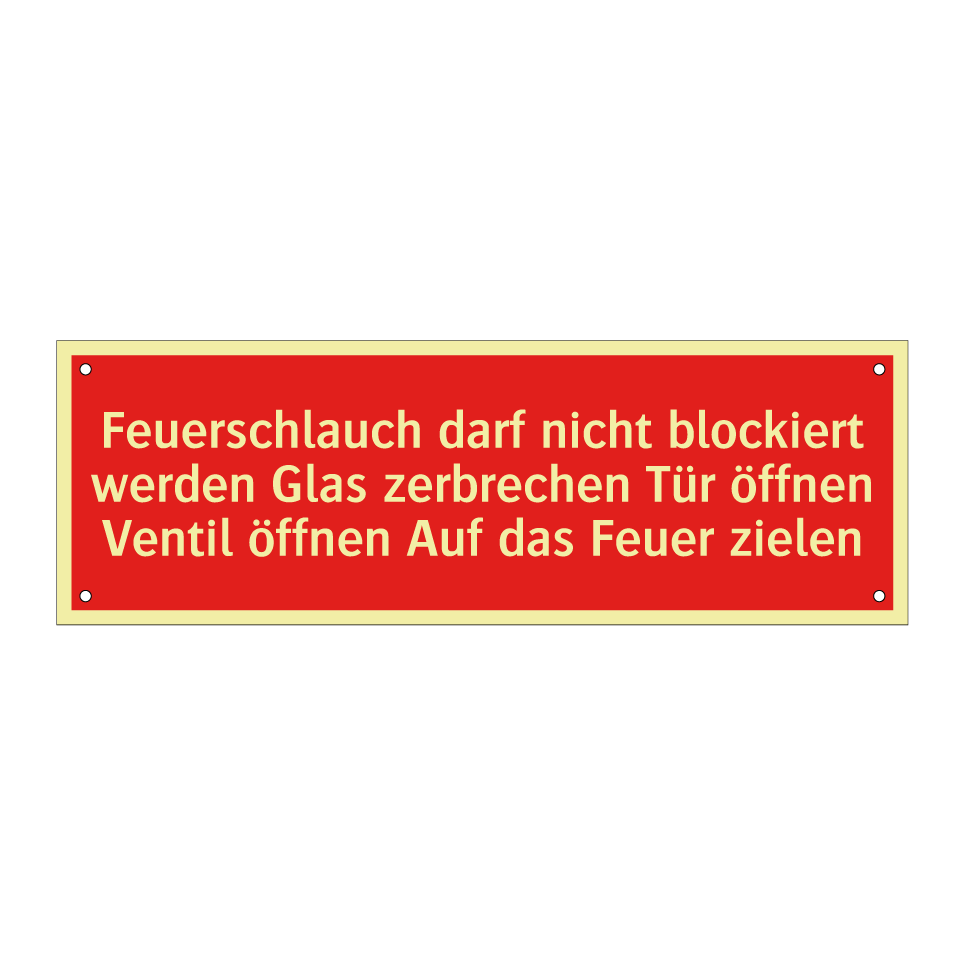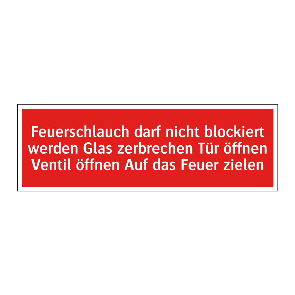 Brandschutzschild mit dem Text Feuerschlauch darf nicht blockiert werden Glas zerbrechen Tür öffnen Ventil öffnen Auf das Feuer zielen