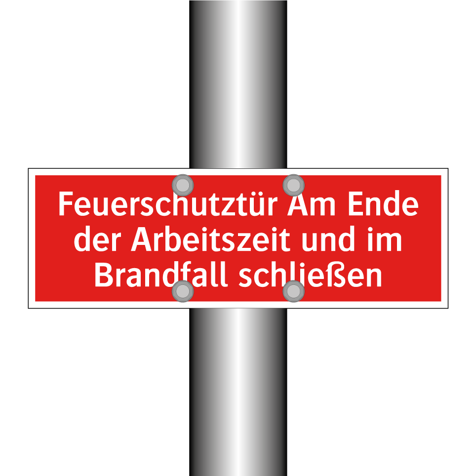 Brandschutzschild mit dem Text Feuerschutztür Am Ende der Arbeitszeit und im Brandfall schließen