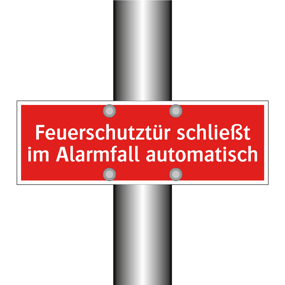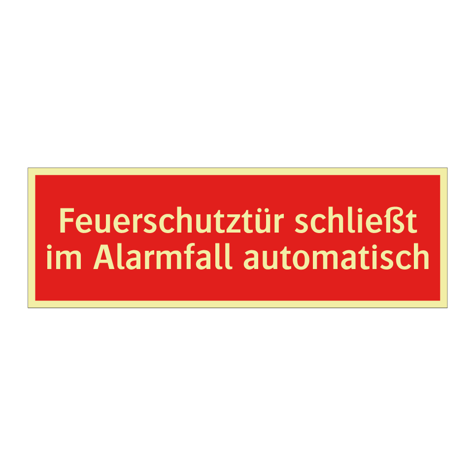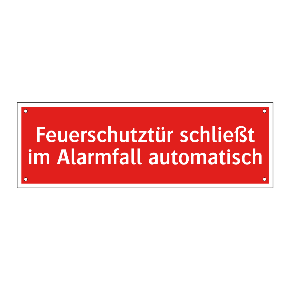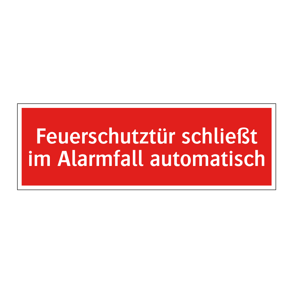 Brandschutzschild mit dem Text Feuerschutztür schließt im Alarmfall automatisch
