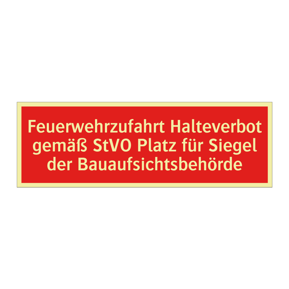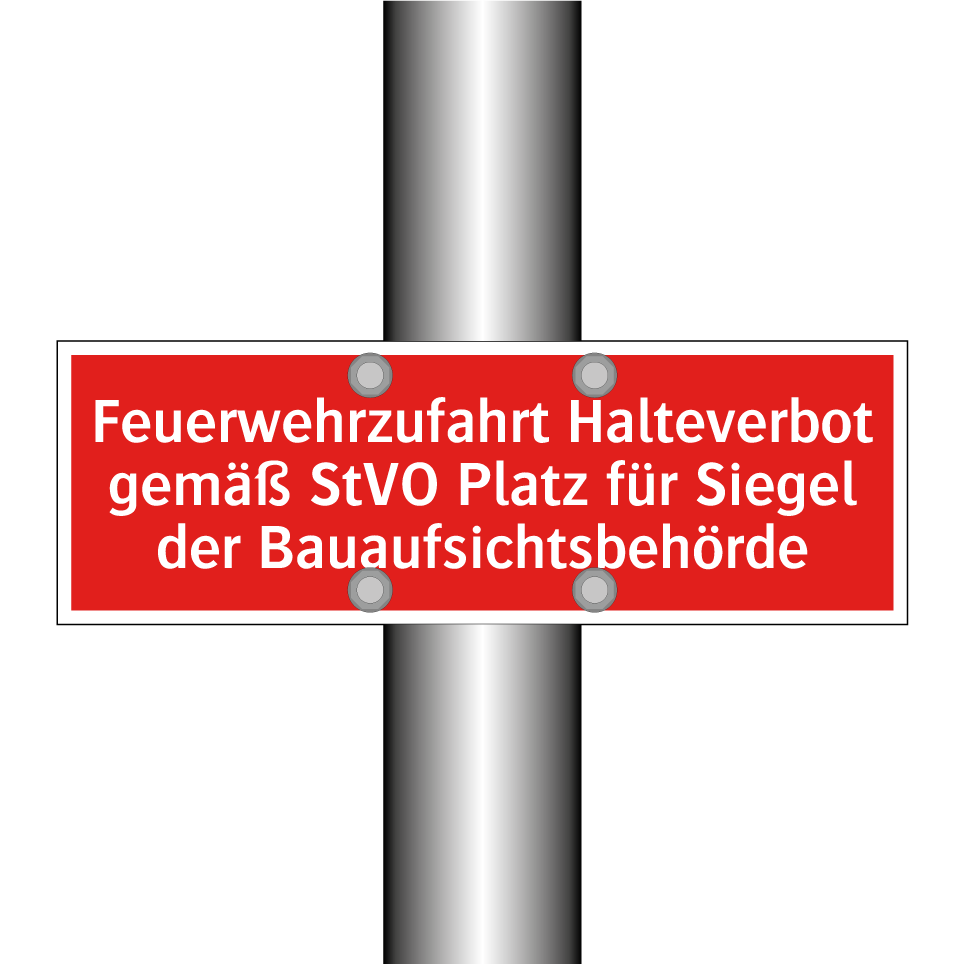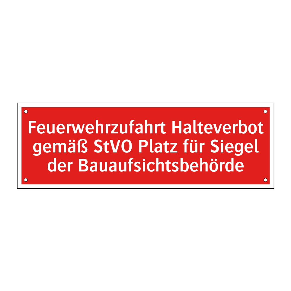 Brandschutzschild mit dem Text Feuerwehrzufahrt Halteverbot gemäß StVO Platz für Siegel der Bauaufsichtsbehörde