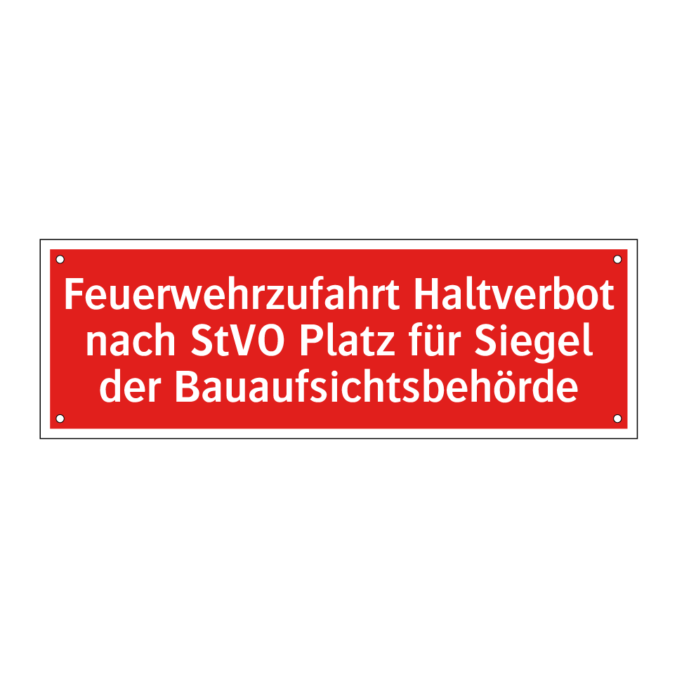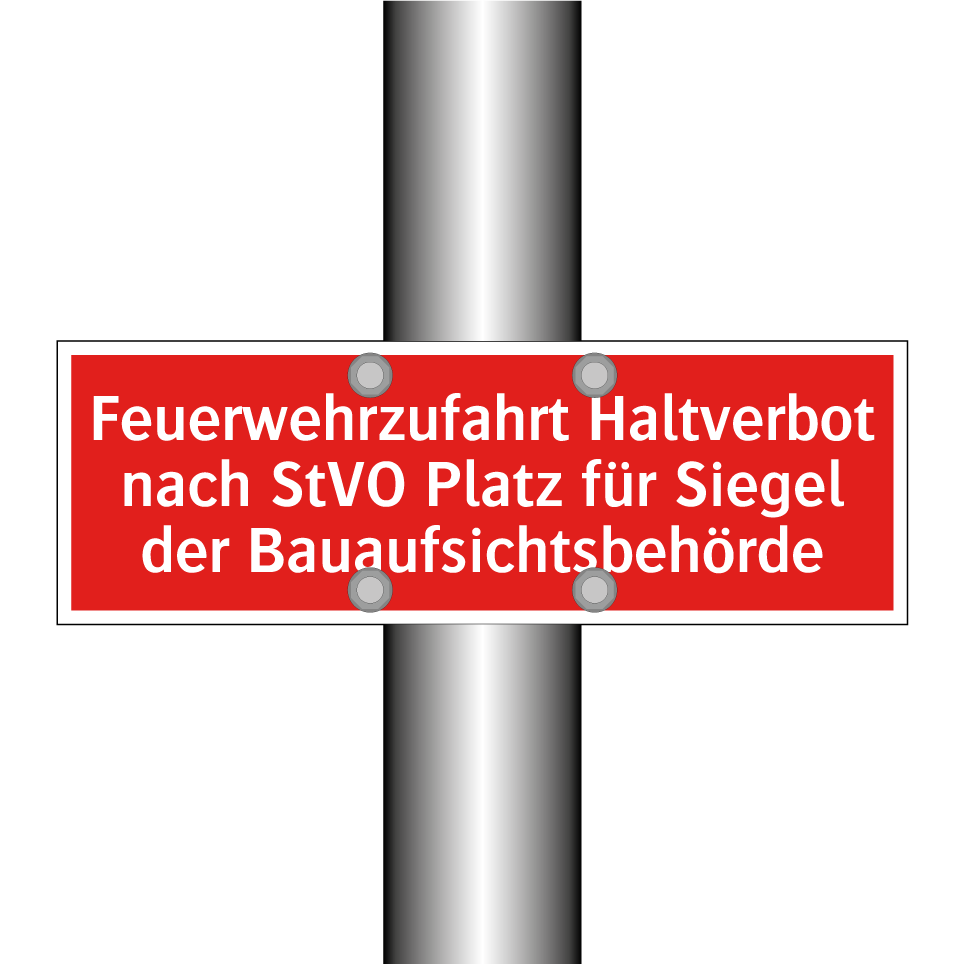 Brandschutzschild mit dem Text Feuerwehrzufahrt Haltverbot nach StVO Platz für Siegel der Bauaufsichtsbehörde