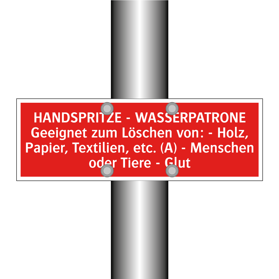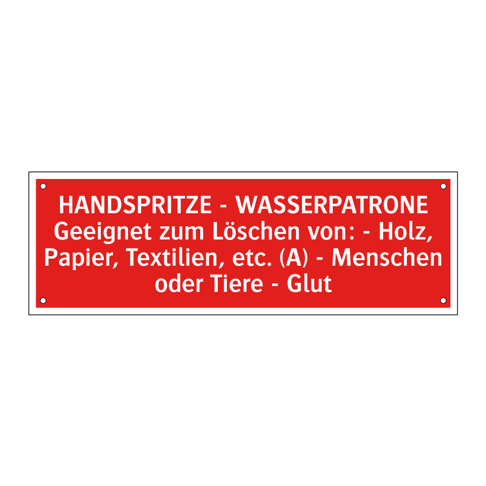 Brandschutzschild mit dem Text HANDSPRITZE - WASSERPATRONE Geeignet zum Löschen von: - Holz, Papier, Textilien, etc. (A) - Menschen oder Tiere - Glut