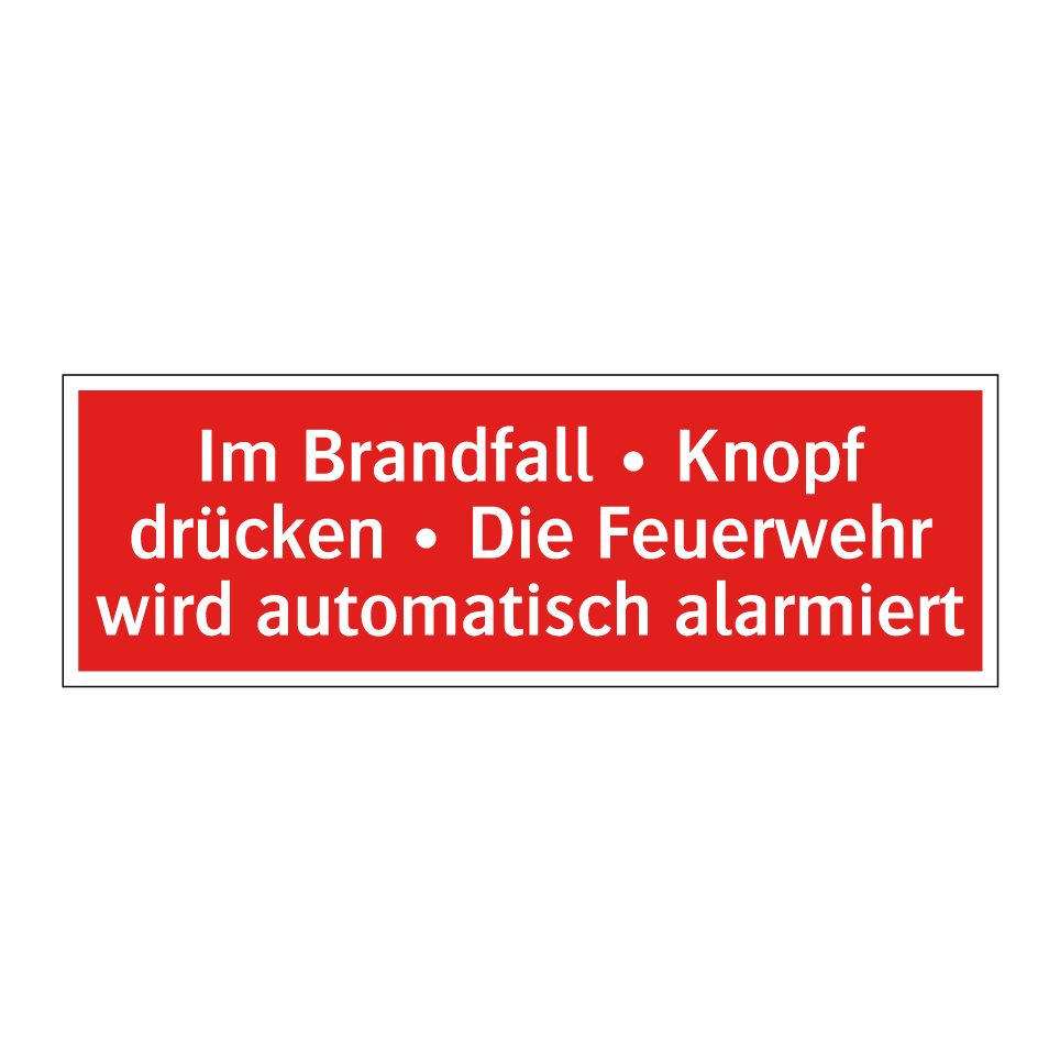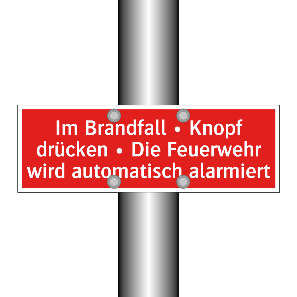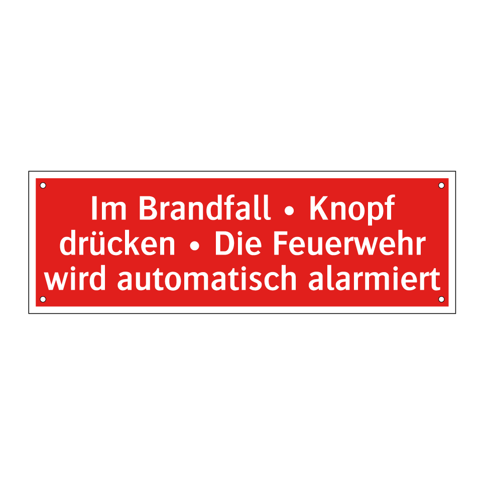 Brandschutzschild mit dem Text Im Brandfall • Knopf drücken • Die Feuerwehr wird automatisch alarmiert