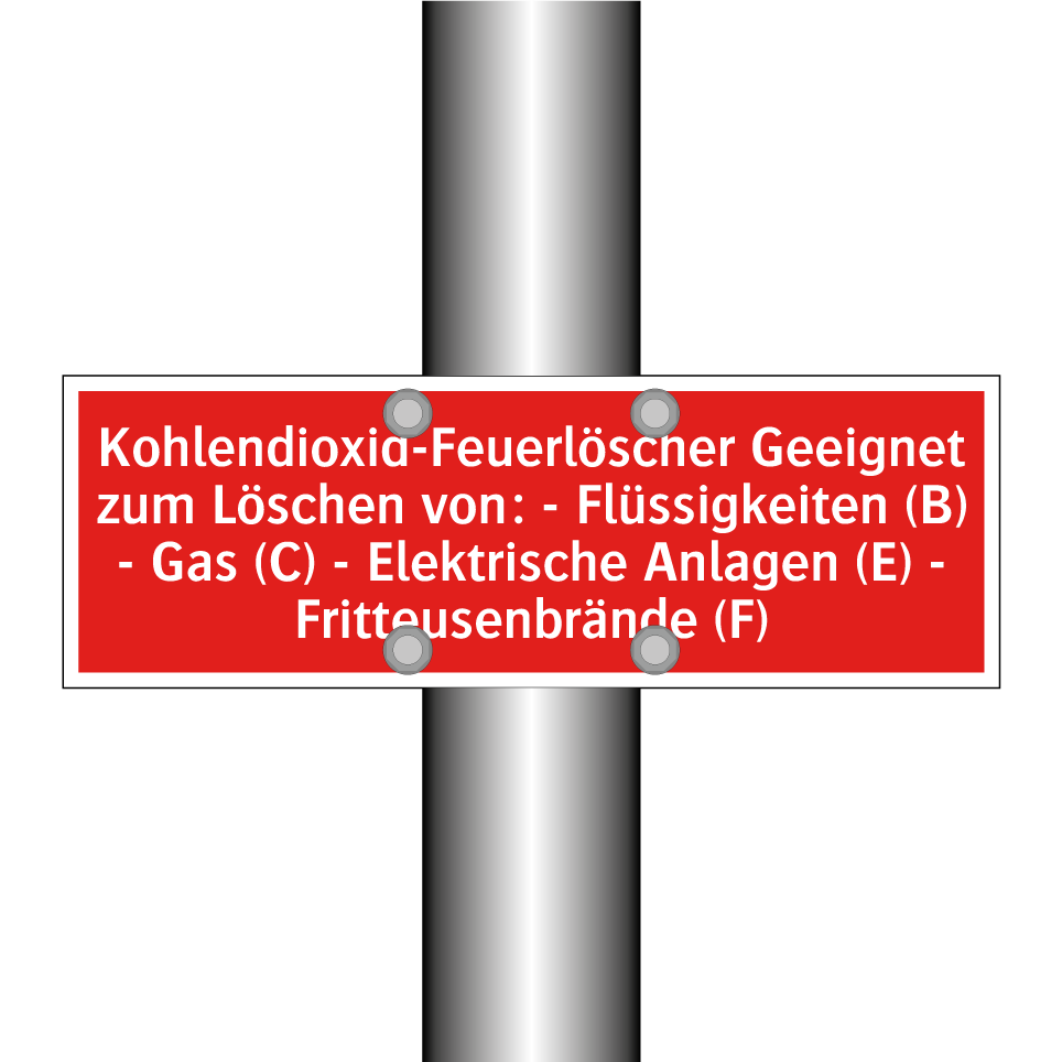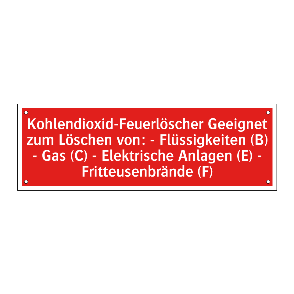 Brandschutzschild mit dem Text Kohlendioxid-Feuerlöscher Geeignet zum Löschen von: - Flüssigkeiten (B) - Gas (C) - Elektrische Anlagen (E) - Fritteusenbrände (F)