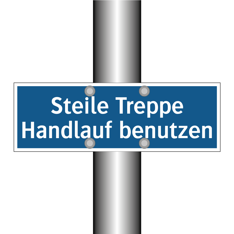 Gebotsschild mit dem Text Steile Treppe Handlauf benutzen