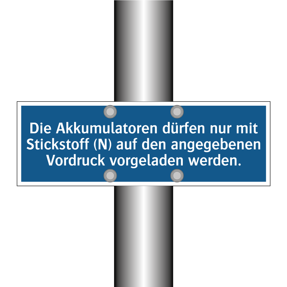 Gebotsschild mit dem Text Die Akkumulatoren dürfen nur mit Stickstoff (N) auf den angegebenen Vordruck vorgeladen werden.