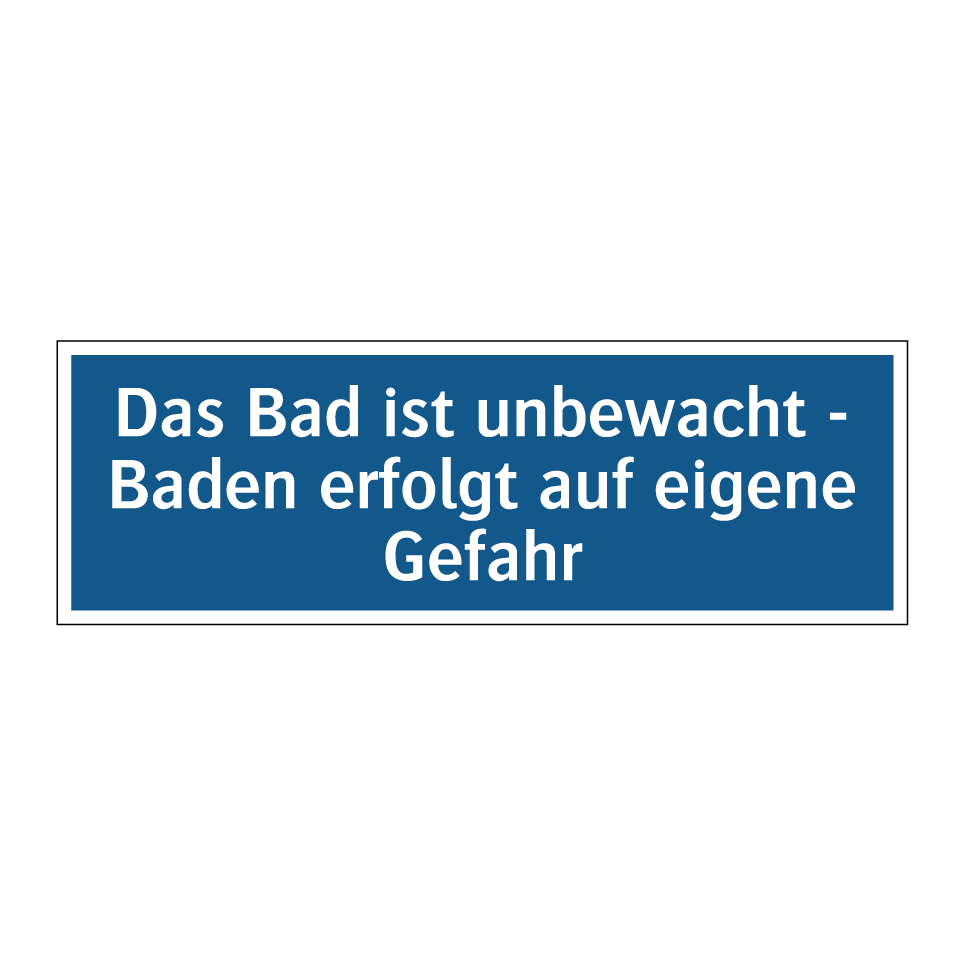 Diese Gebotsschild mit blauem Hintergrund und weißer Schrift ist ideal für Schwimmbäder, Seen oder andere Badebereiche, in denen keine Aufsichtspersonen vorhanden sind. Sie erinnert Badegäste daran, dass sie auf eigene Verantwortung schwimmen und baden. Diese wichtige Sicherheitsinformation kann an Eingängen, Umkleidekabinen oder in der Nähe von Wasserzugängen angebracht werden, um Besucher zu informieren und zu schützen. Die klare und deutliche Botschaft dieser Gebotsschild sorgt dafür, dass alle Besucher sich der potenziellen Risiken bewusst sind und entsprechend handeln. Perfekt für öffentliche und private Badeeinrichtungen, um die Sicherheit zu erhöhen.