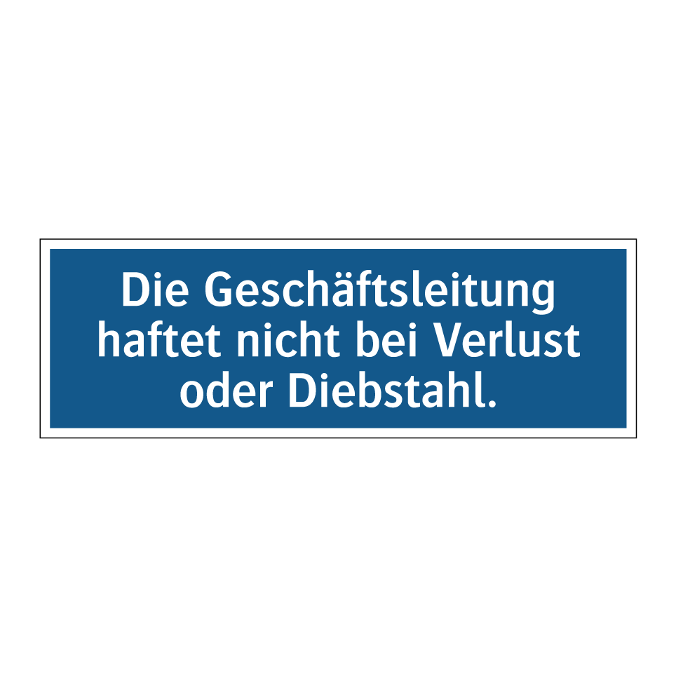 Gebotsschild mit dem Text Die Geschäftsleitung haftet nicht bei Verlust oder Diebstahl.