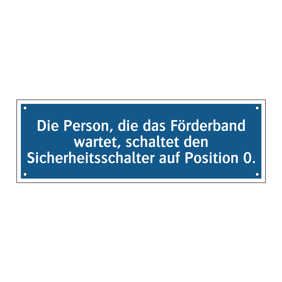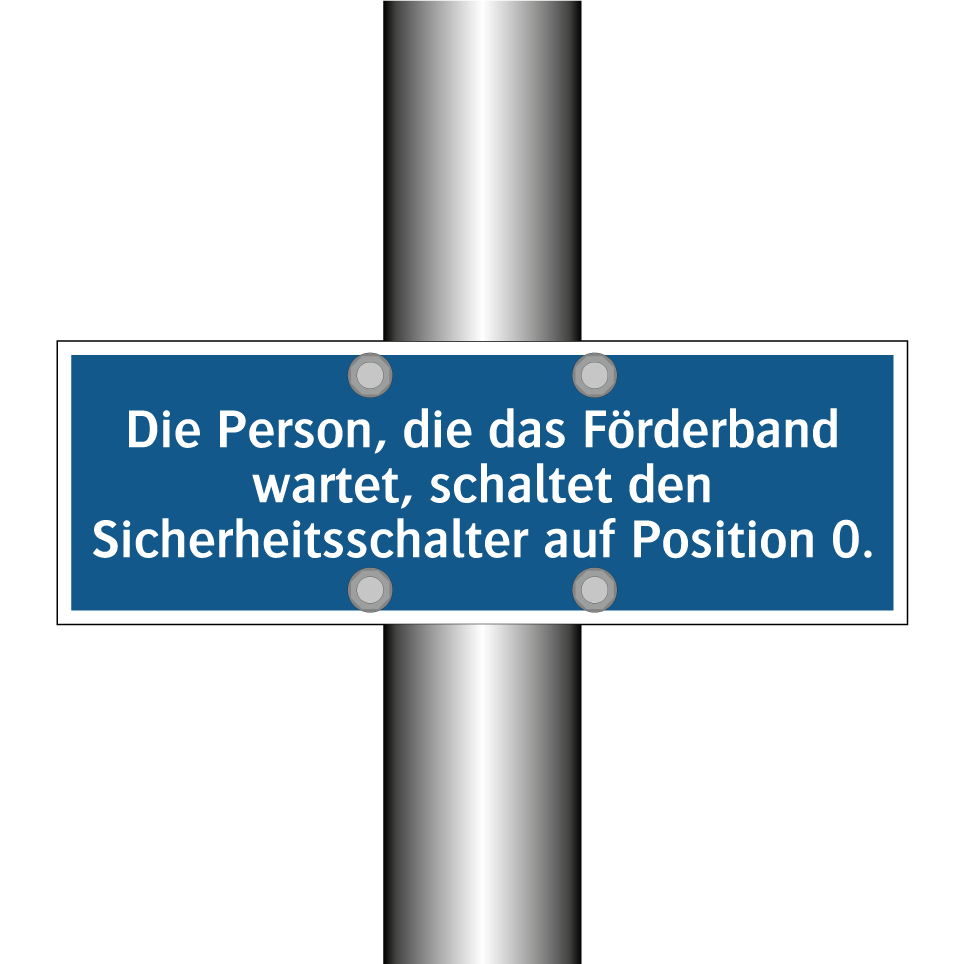Gebotsschild mit dem Text Die Person, die das Förderband wartet, schaltet den Sicherheitsschalter auf Position 0.