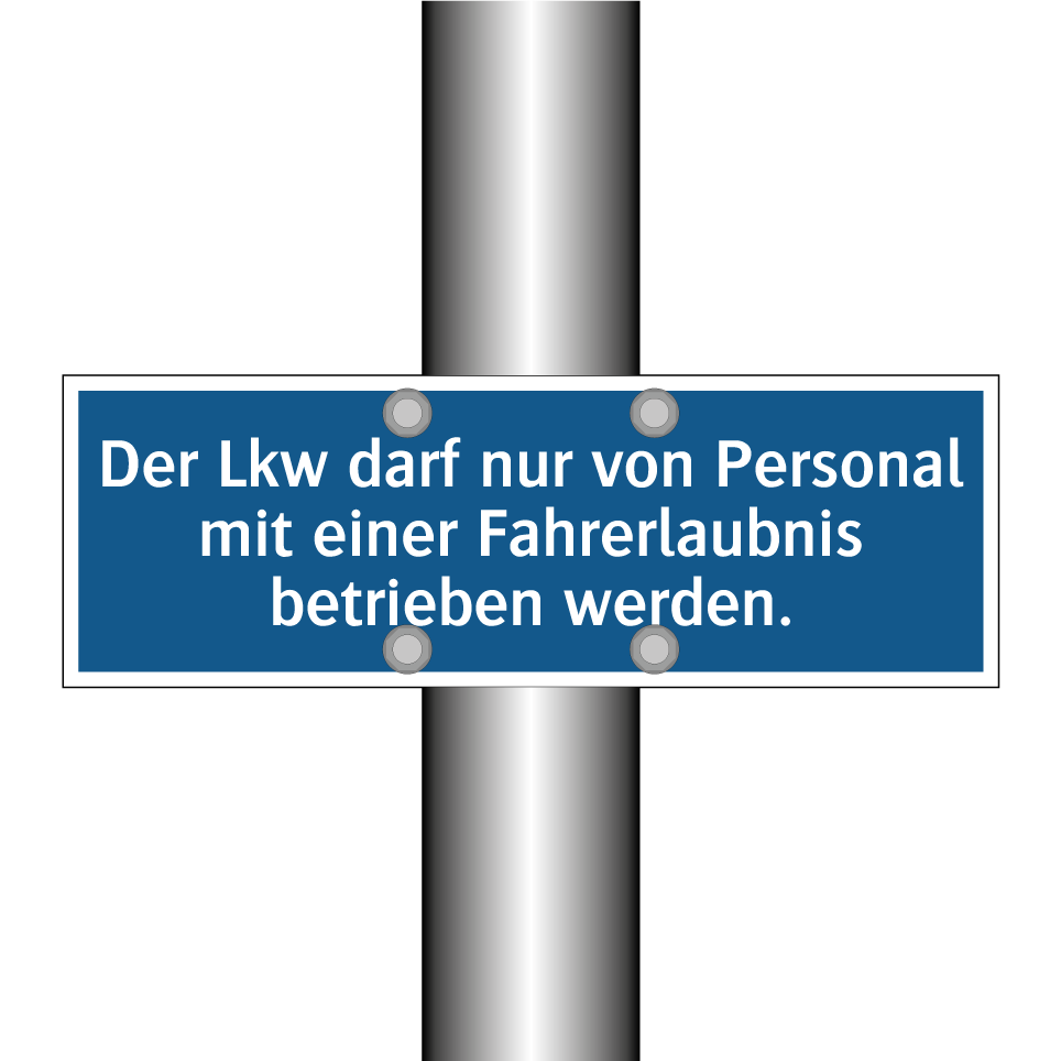 Gebotsschild mit dem Text Der Lkw darf nur von Personal mit einer Fahrerlaubnis betrieben werden.