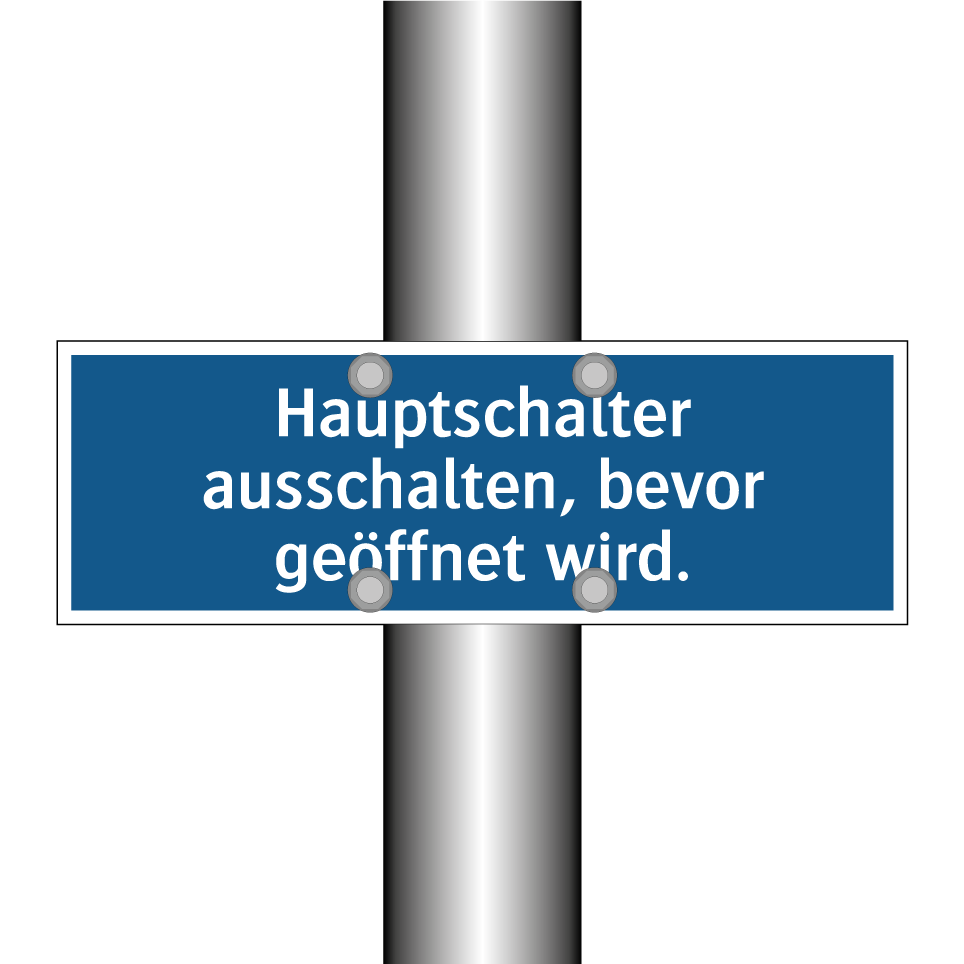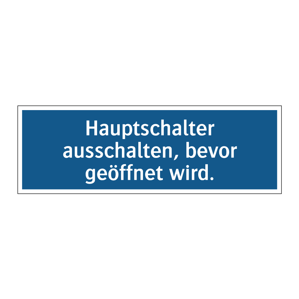 Gebotsschild mit dem Text Hauptschalter ausschalten, bevor geöffnet wird.