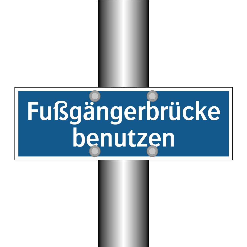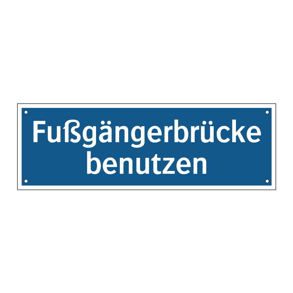 Diese Gebotsschild mit blauem Hintergrund und weißer Schrift ist ideal für die sichere Führung von Fußgängern. Sie weist darauf hin, dass eine Fußgängerbrücke genutzt werden soll, um den Verkehr sicher zu überqueren. Diese Anweisung ist besonders nützlich in Bereichen mit hohem Verkehrsaufkommen, wie in der Nähe von Schulen, Einkaufszentren oder Bürokomplexen. Die klare und deutliche Darstellung sorgt dafür, dass Passanten die Anweisung leicht erkennen und befolgen können. Platzieren Sie dieses Schild an strategischen Punkten, um die Sicherheit zu erhöhen und Unfälle zu vermeiden. Es ist ein unverzichtbares Element für jede Umgebung, die auf Fußgängersicherheit Wert legt.