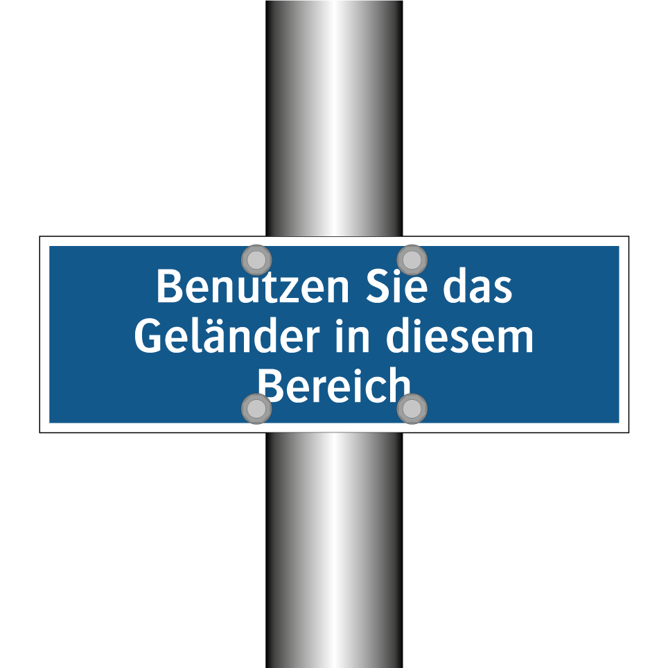 Gebotsschild mit dem Text Benutzen Sie das Geländer in diesem Bereich