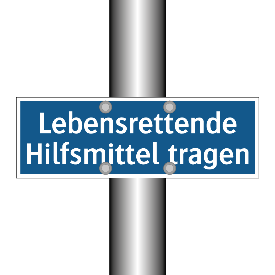 Gebotsschild mit dem Text Lebensrettende Hilfsmittel tragen