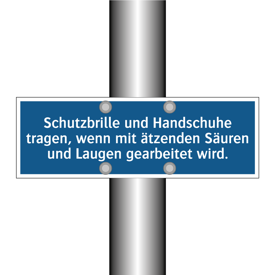 Gebotsschild mit dem Text Schutzbrille und Handschuhe tragen, wenn mit ätzenden Säuren und Laugen gearbeitet wird.