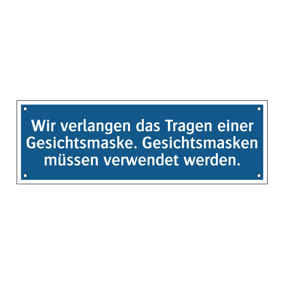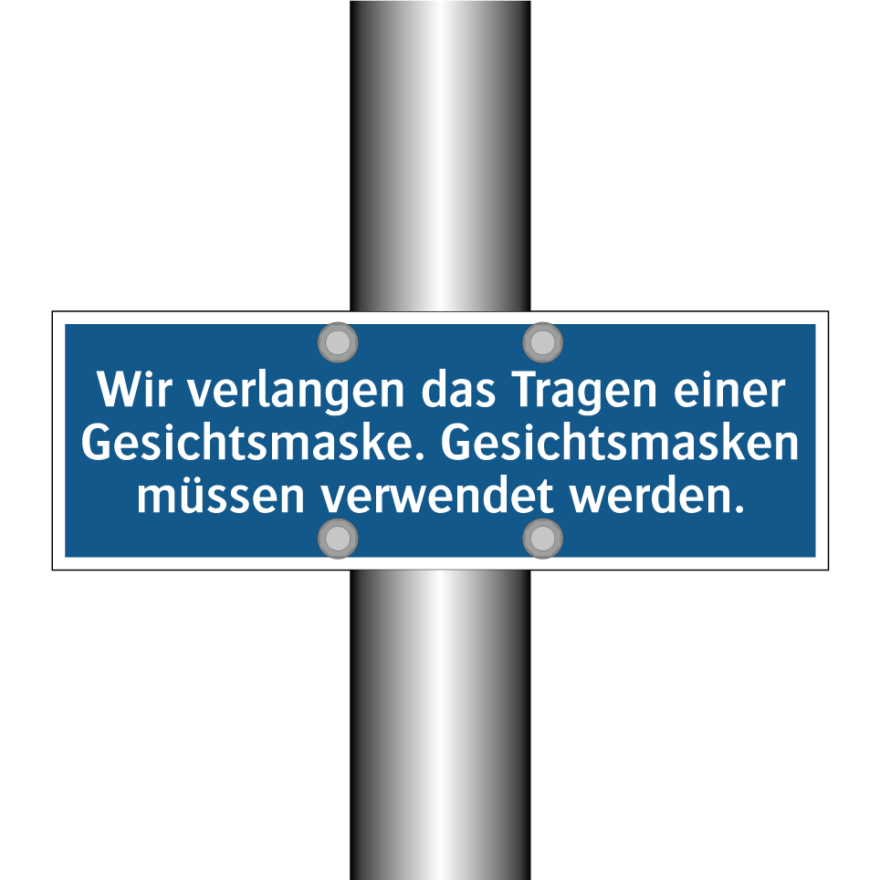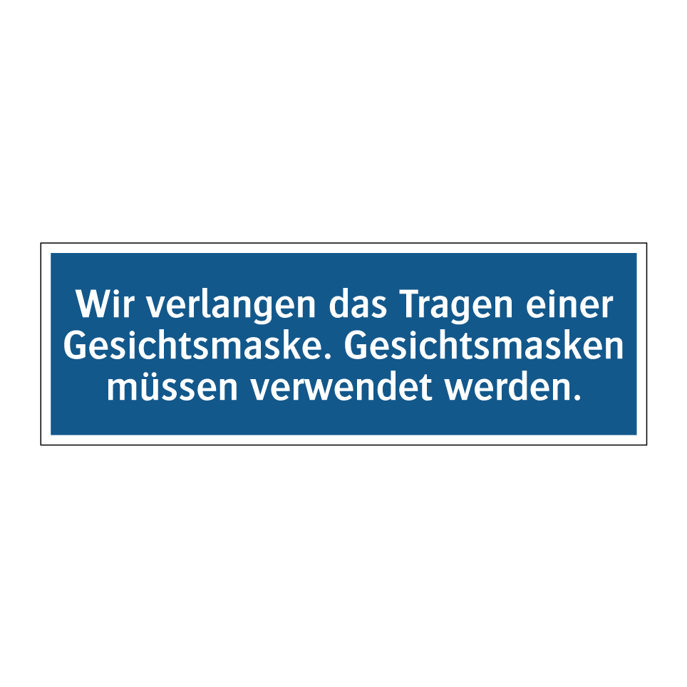 Gebotsschild mit dem Text Wir verlangen das Tragen einer Gesichtsmaske. Gesichtsmasken müssen verwendet werden.
