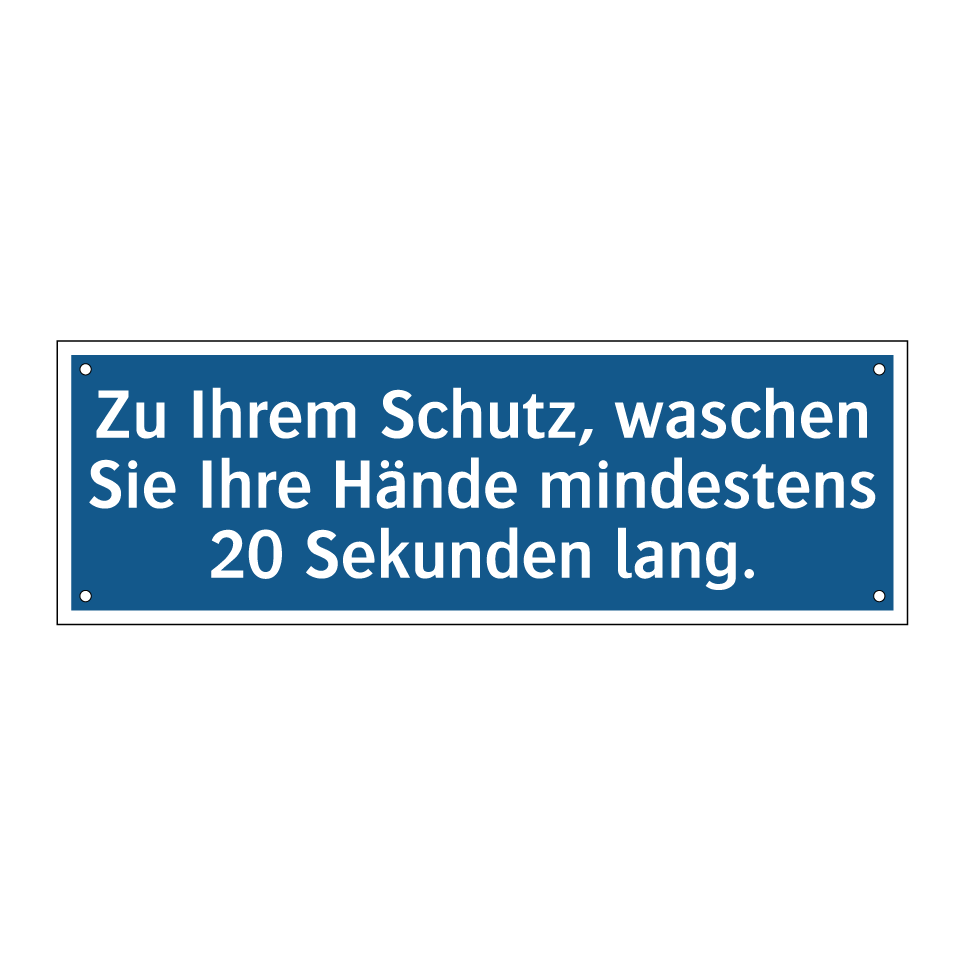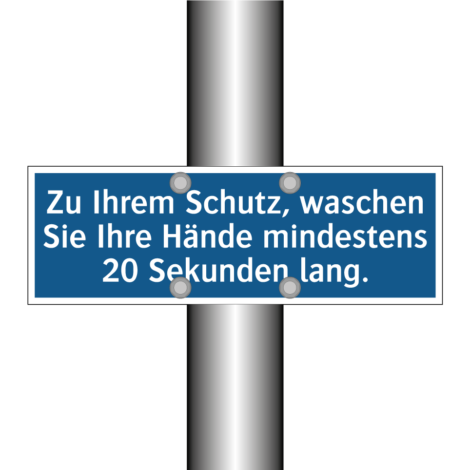 Gebotsschild mit dem Text Zu Ihrem Schutz, waschen Sie Ihre Hände mindestens 20 Sekunden lang.