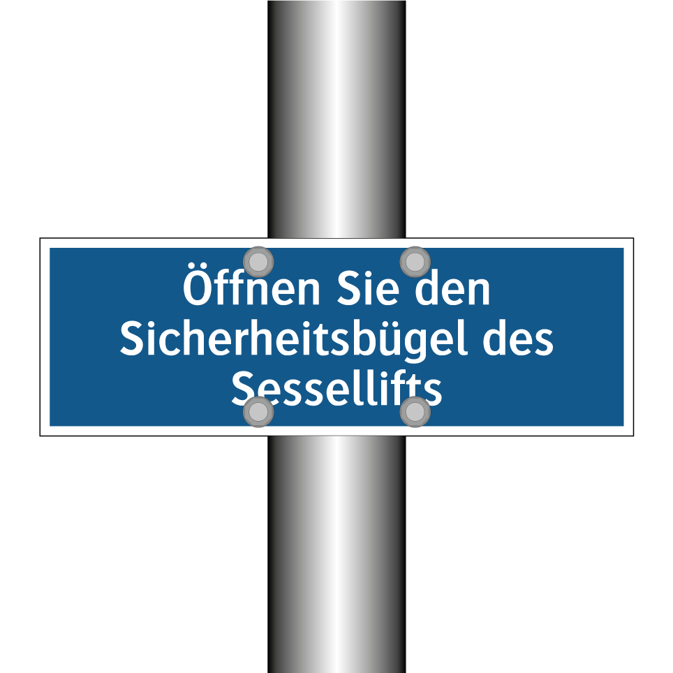 Gebotsschild mit dem Text Öffnen Sie den Sicherheitsbügel des Sessellifts
