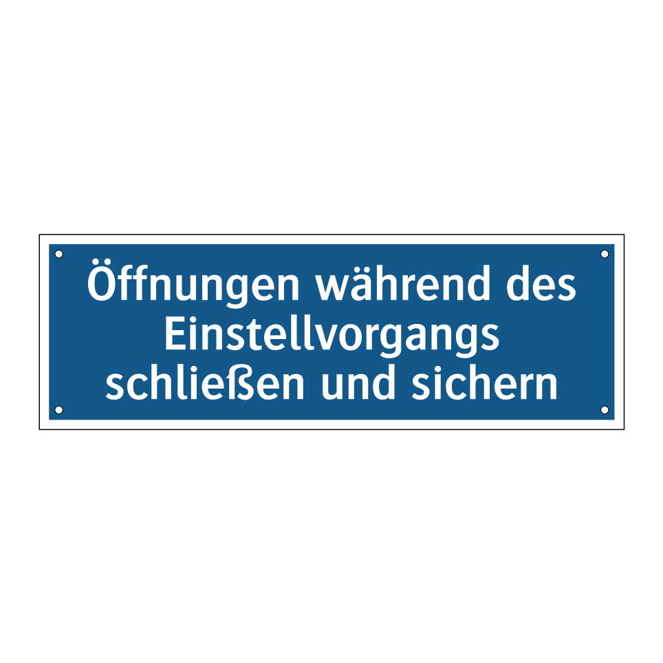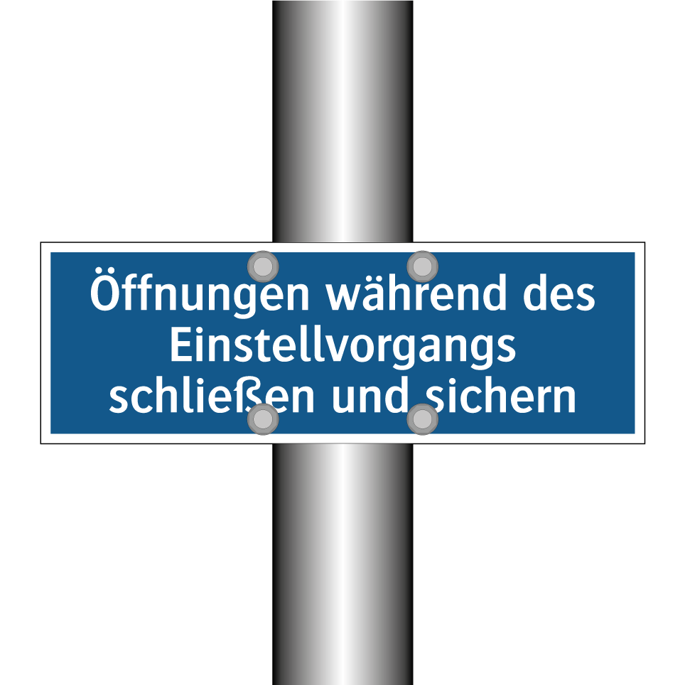 Gebotsschild mit dem Text Öffnungen während des Einstellvorgangs schließen und sichern