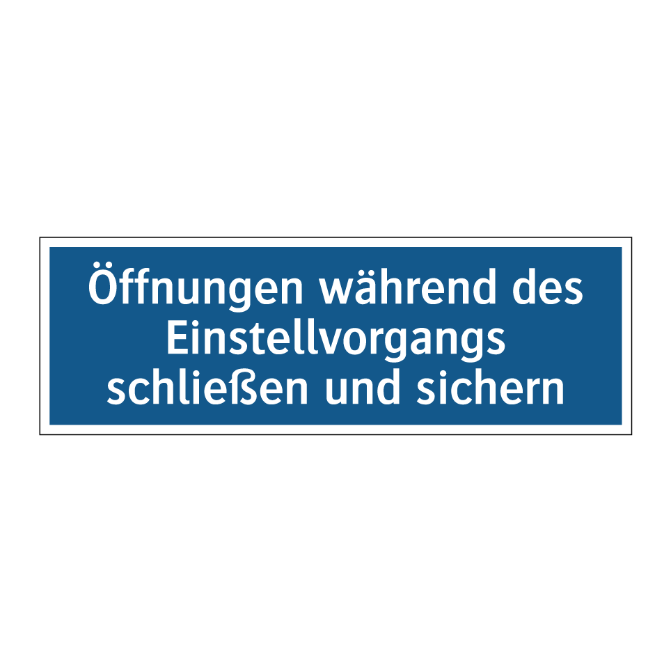 Diese Gebotsschild ist ein unverzichtbares Element für die Sicherheit in industriellen und gewerblichen Umgebungen. Sie erinnert daran, dass alle Öffnungen während des Einstellvorgangs geschlossen und gesichert werden müssen, um Unfälle zu vermeiden. Diese Anweisung ist besonders wichtig in Bereichen, in denen Maschinen oder technische Anlagen betrieben werden. Die Gebotsschild kann strategisch an Eingängen zu Werkstätten, Produktionshallen oder Maschinenräumen platziert werden, um sicherzustellen, dass alle Mitarbeiter und Besucher die Sicherheitsvorschriften einhalten. Durch die klare blaue Hintergrundfarbe und die weiße Schrift ist die Botschaft leicht erkennbar und verständlich.